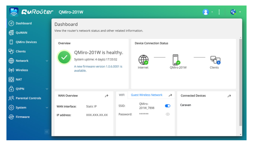 QMiro-201W 搭載 QuRouter OS 路由器管理系統,具備友善圖形化網頁管理介面及一目瞭然的總覽頁,幫助用戶快速掌握網路連線狀態。您可在系統裡將 QMiro-201W 設定為無線路由或 AP 模式,指定由 QMiro-201W 作為主要路由器主動發送 IP 或者接收其他主要路由器的 IP,同時可有效管理內外網的有線、無線的連網裝置,還能執行 NAT、 VPN、安全性與 QuWAN 網路等進階功能設定。