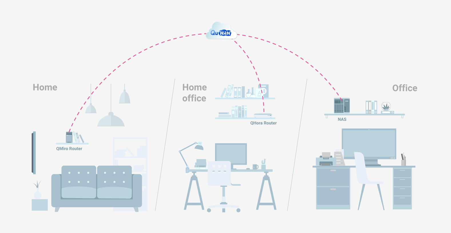 遠距工作 (WFH) 趨勢改變了家庭生活面貌,多分點商務型態 (Multi-site businesses) 潮流興起,為傳統的網路架構帶來挑戰。QNAP QuWAN 是一個整體網路架構自動組網方案,從企業網路到個人家庭 Router,皆能高效組建 VPN 網路。您只要在家將 QMiro-201W 設定完成,QuWAN 雲端中控系統可直接將 QMiro-201W 加入 VPN 網路,且無論 QMiro-201W 是在路由或 AP 模式下皆支援 SD-WAN 連線,此時,您的 QMiro-201W 就成為您連入公司雲的入口。