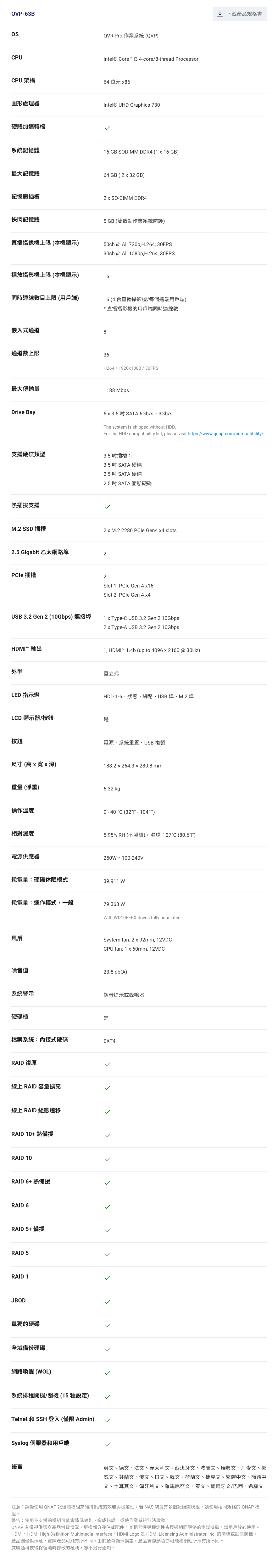 QVP-63B QVR Pro 專用機為桌上型的安全監控伺服器,搭載 Intel® Core™ 多核心處理器,內建 QVR Pro 監控軟體,免費提供 8 個攝影機頻道,支援最高可擴充至 36 個攝影機頻道;經濟實惠的監控錄影一體機,協助中小企業與小型辦公室輕鬆打造安全、可靠、集中儲存管理的高效能影像監控環境。