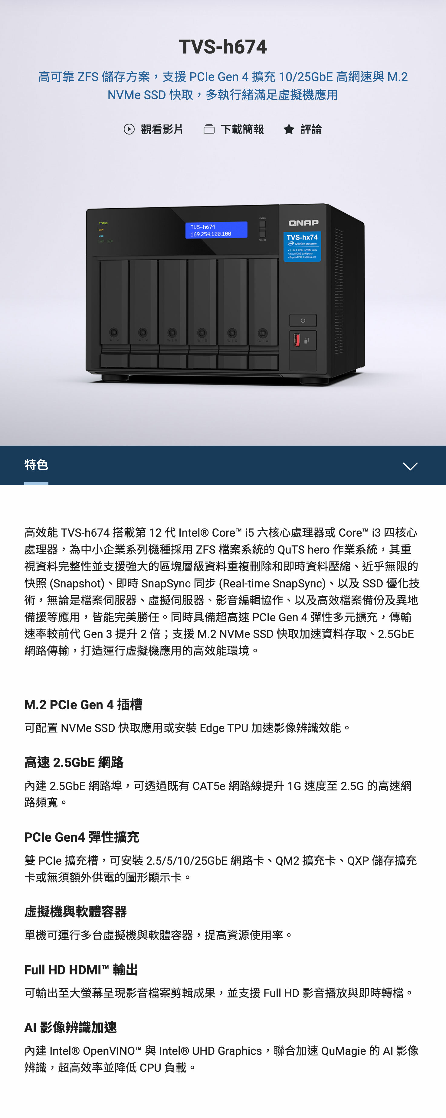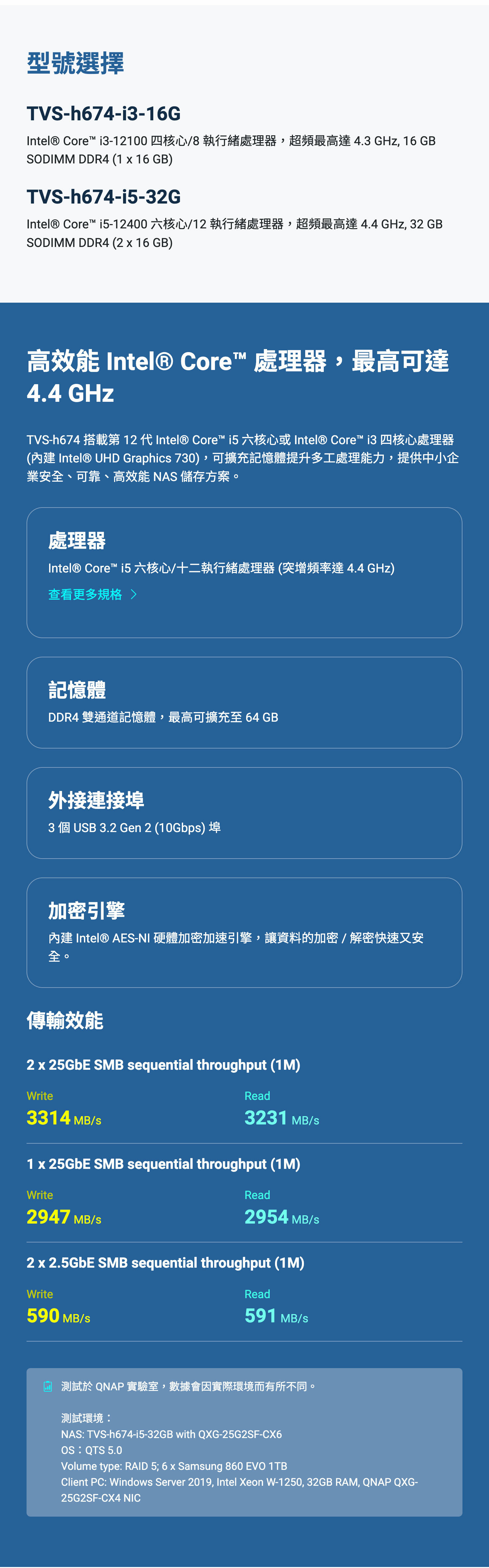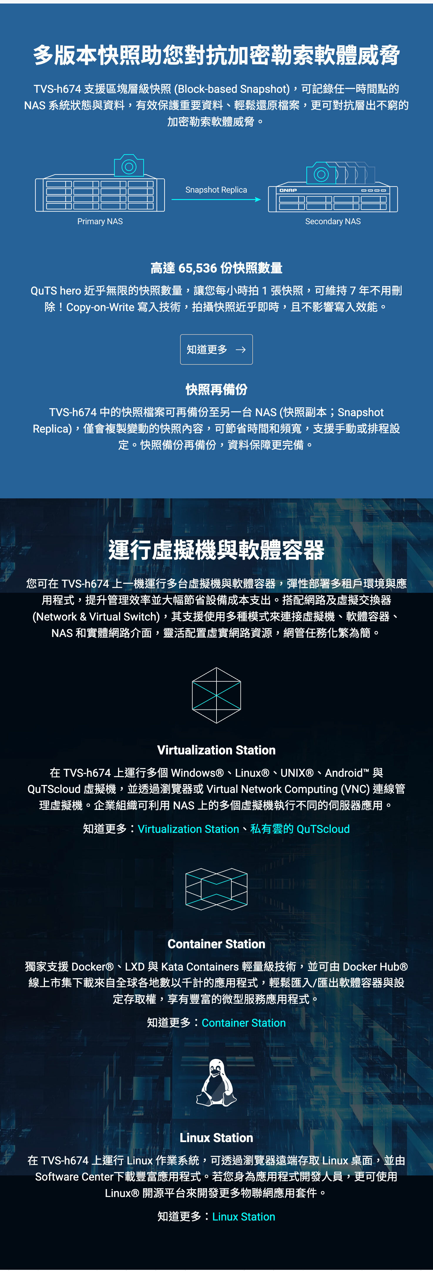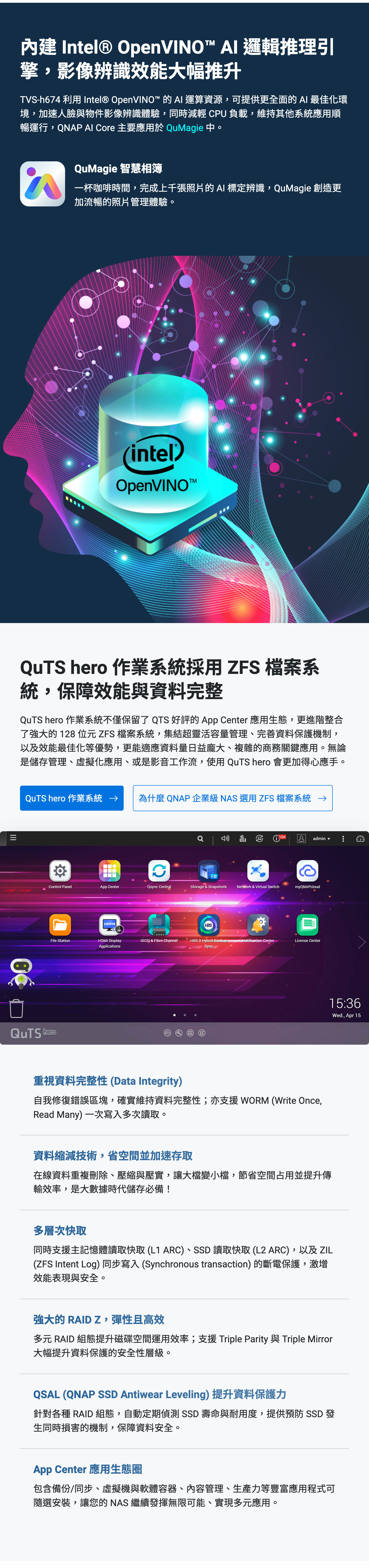 高效能 TVS-h674 搭載第 12 代 Intel® Core™ i5 六核心處理器或 Core™ i3 四核心處理器,為中小企業系列機種採用 ZFS 檔案系統的 QuTS hero 作業系統,其重視資料完整性並支援強大的區塊層級資料重複刪除和即時資料壓縮、近乎無限的快照 (Snapshot)、即時 SnapSync 同步 (Real-time SnapSync)、以及 SSD 優化技術,無論是檔案伺服器、虛擬伺服器、影音編輯協作、以及高效檔案備份及異地備援等應用,皆能完美勝任。同時具備超高速 PCIe Gen 4 彈性多元擴充,傳輸速率較前代 Gen 3 提升 2 倍;支援 M.2 NV