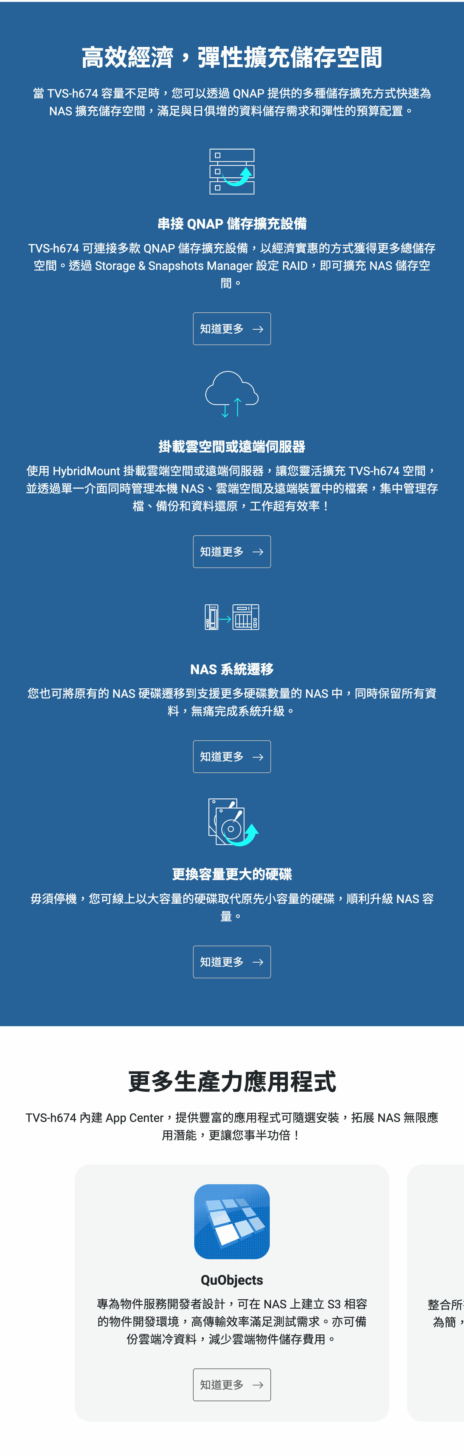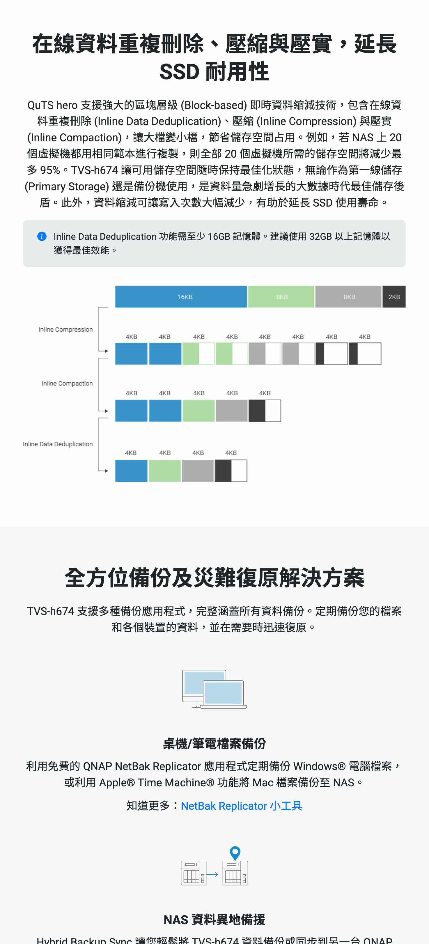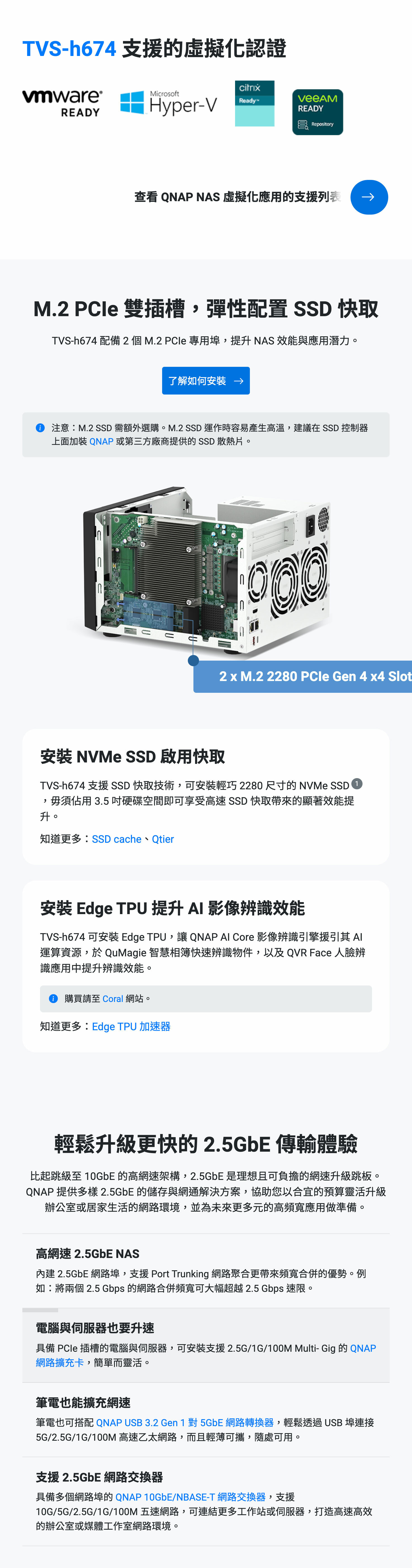 高效能 TVS-h674 搭載第 12 代 Intel® Core™ i5 六核心處理器或 Core™ i3 四核心處理器,為中小企業系列機種採用 ZFS 檔案系統的 QuTS hero 作業系統,其重視資料完整性並支援強大的區塊層級資料重複刪除和即時資料壓縮、近乎無限的快照 (Snapshot)、即時 SnapSync 同步 (Real-time SnapSync)、以及 SSD 優化技術,無論是檔案伺服器、虛擬伺服器、影音編輯協作、以及高效檔案備份及異地備援等應用,皆能完美勝任。同時具備超高速 PCIe Gen 4 彈性多元擴充,傳輸速率較前代 Gen 3 提升 2 倍;支援 M.2 NV