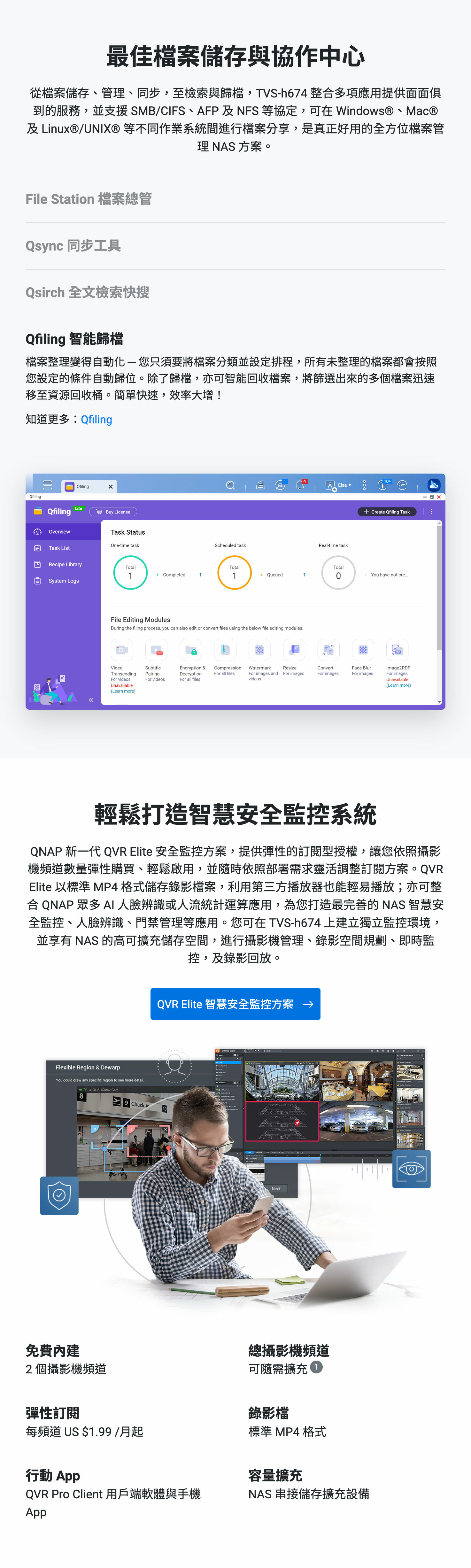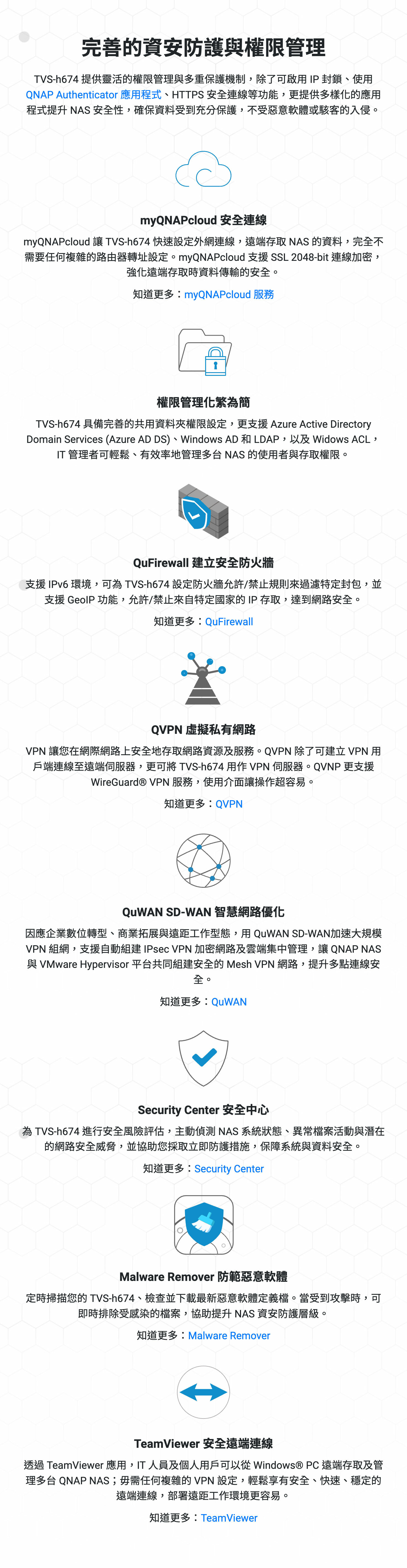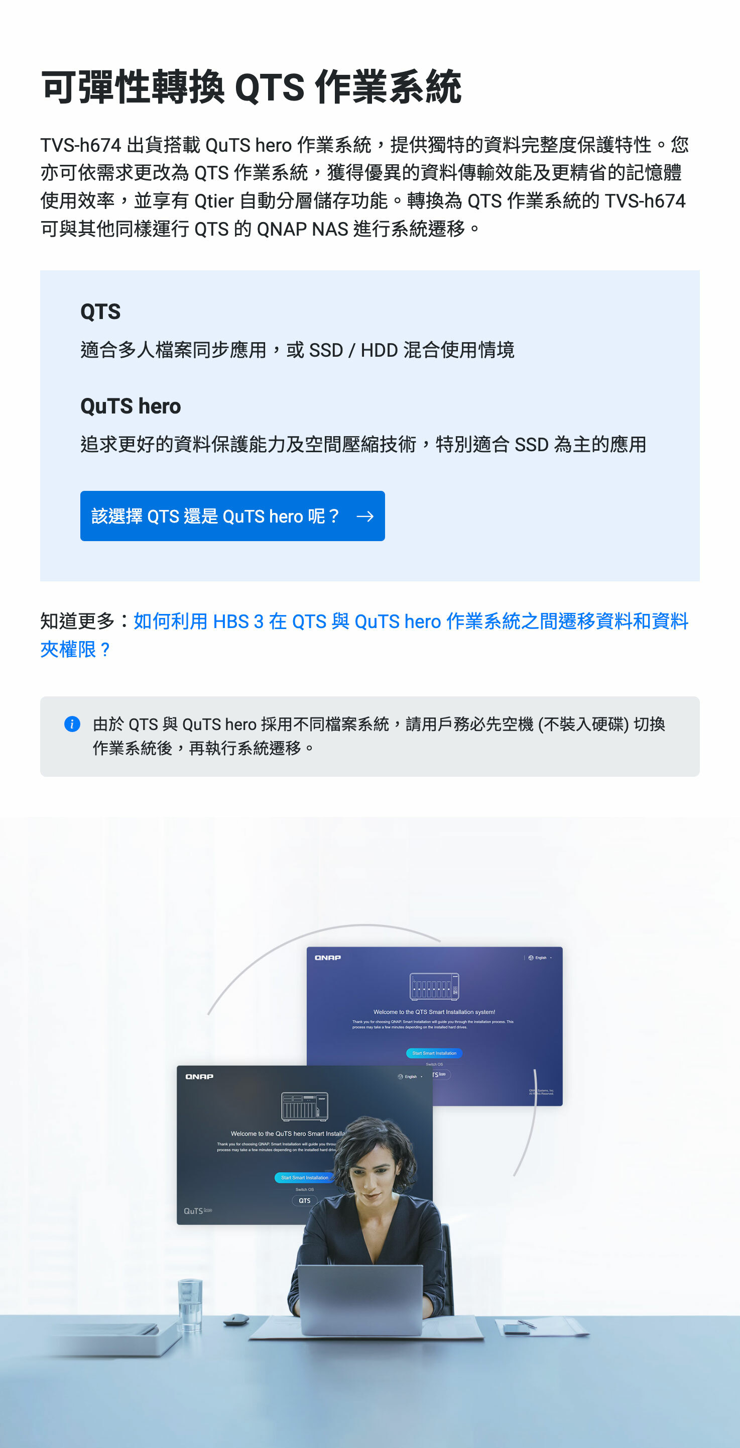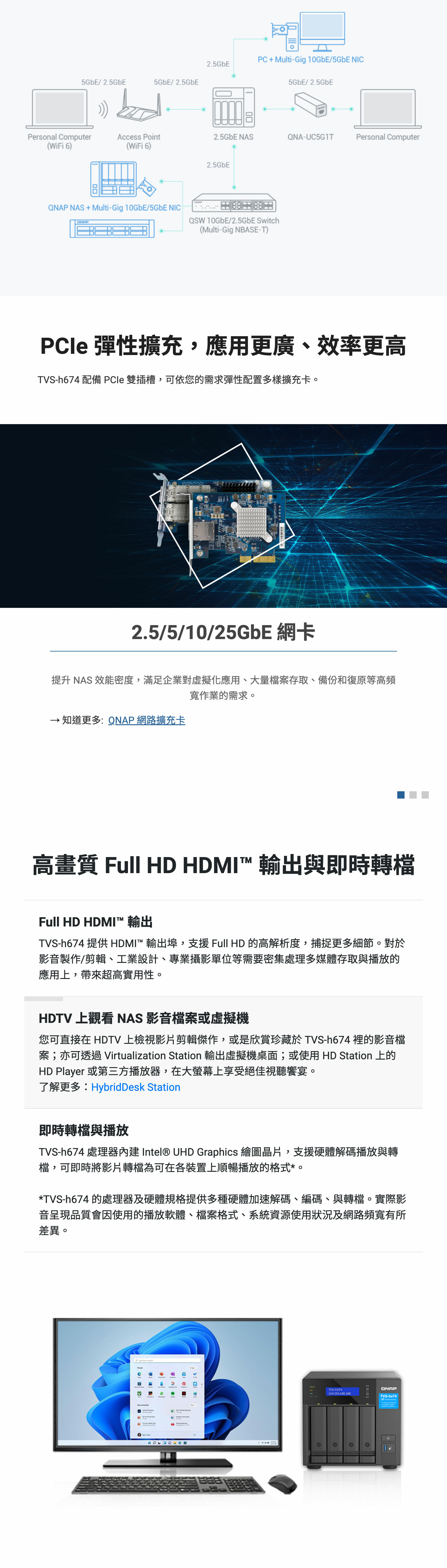 高效能 TVS-h674 搭載第 12 代 Intel® Core™ i5 六核心處理器或 Core™ i3 四核心處理器,為中小企業系列機種採用 ZFS 檔案系統的 QuTS hero 作業系統,其重視資料完整性並支援強大的區塊層級資料重複刪除和即時資料壓縮、近乎無限的快照 (Snapshot)、即時 SnapSync 同步 (Real-time SnapSync)、以及 SSD 優化技術,無論是檔案伺服器、虛擬伺服器、影音編輯協作、以及高效檔案備份及異地備援等應用,皆能完美勝任。同時具備超高速 PCIe Gen 4 彈性多元擴充,傳輸速率較前代 Gen 3 提升 2 倍;支援 M.2 NV