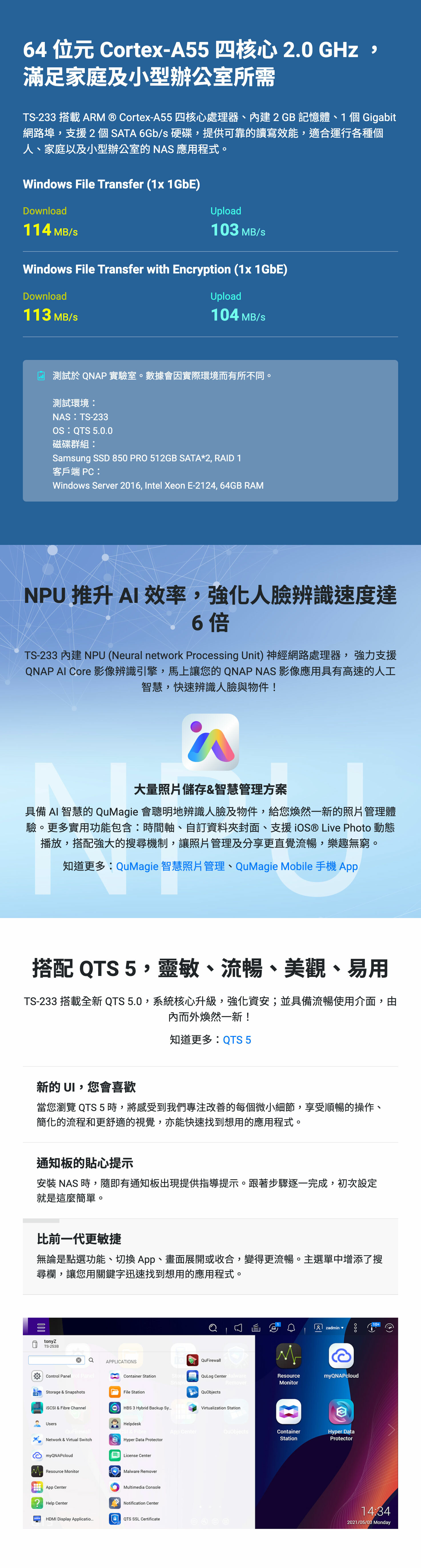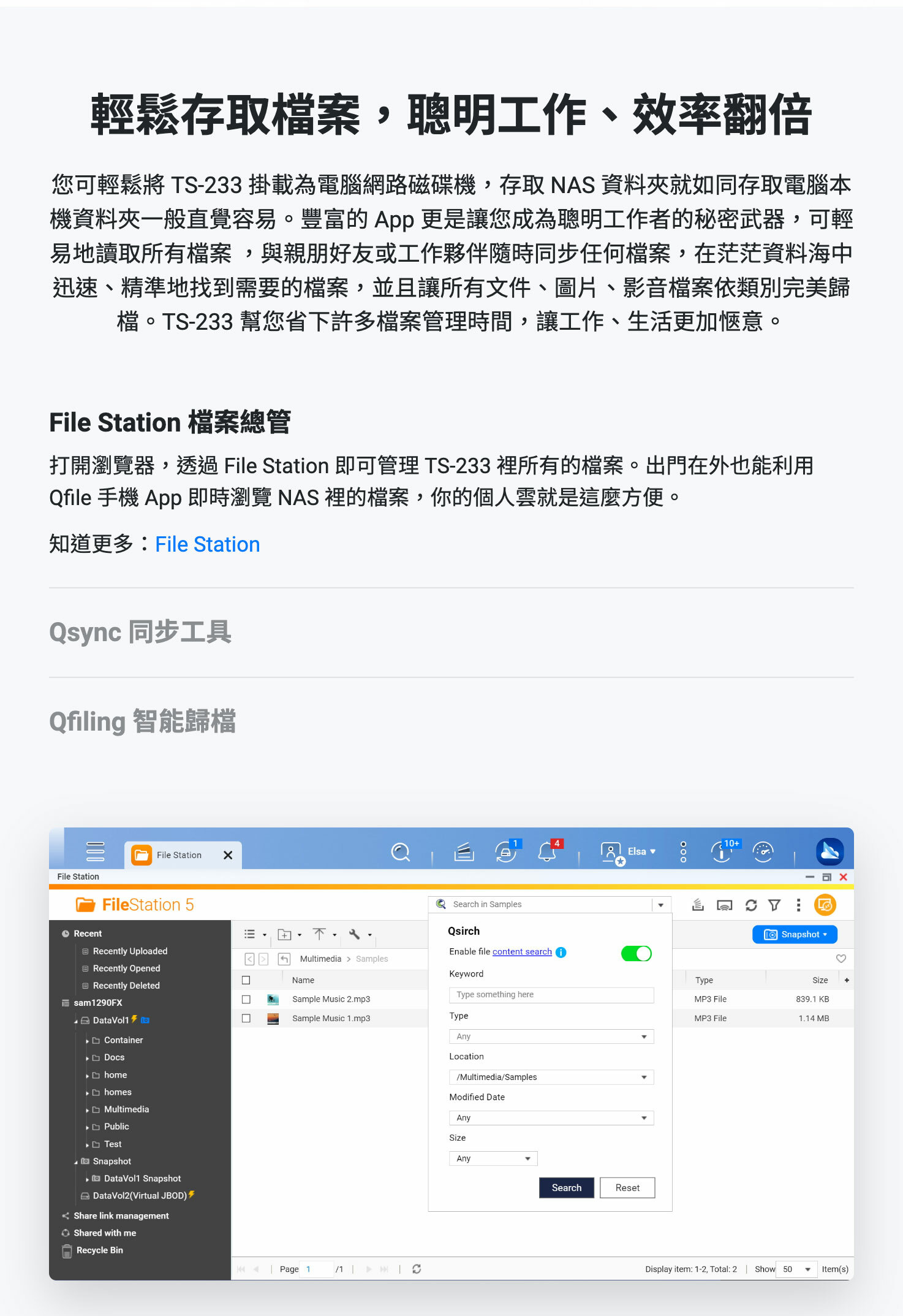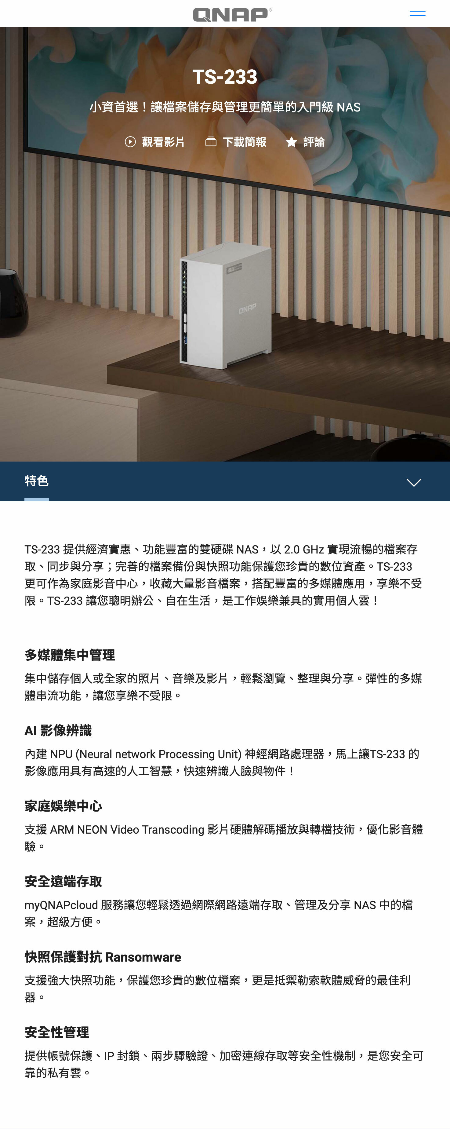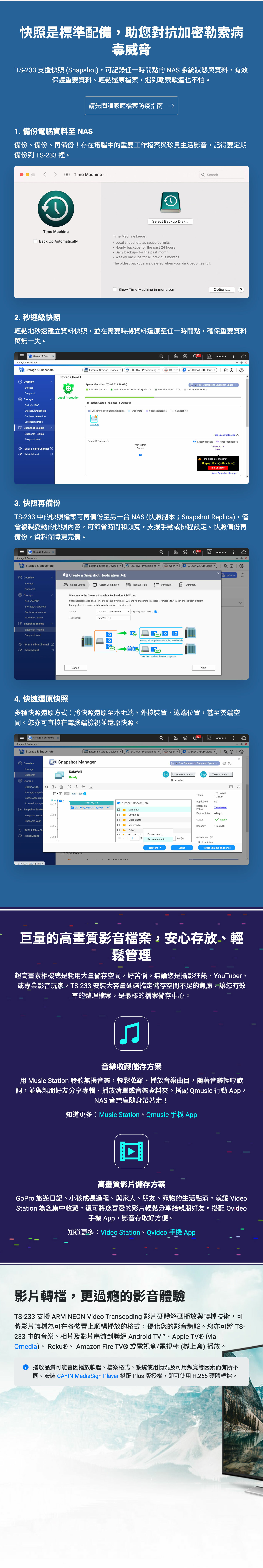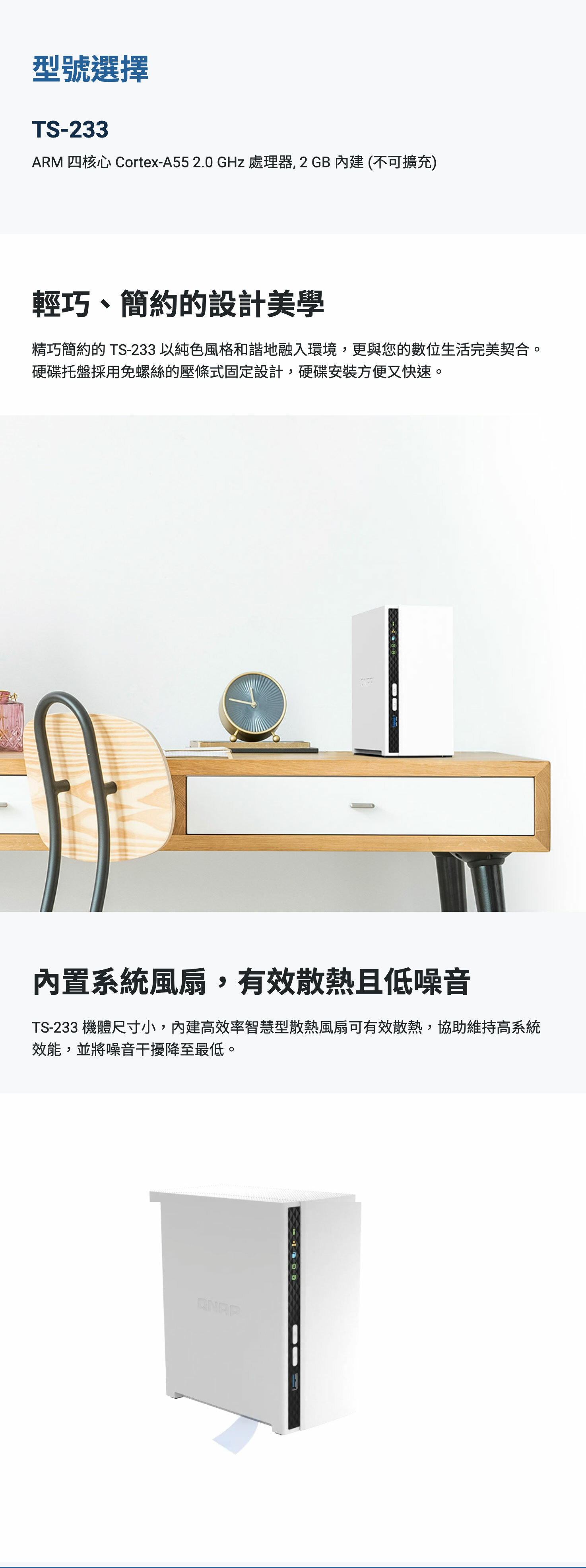 TS-233 提供經濟實惠、功能豐富的雙硬碟 NAS,以 2.0 GHz 實現流暢的檔案存取、同步與分享;完善的檔案備份與快照功能保護您珍貴的數位資產。TS-233 更可作為家庭影音中心,收藏大量影音檔案,搭配豐富的多媒體應用,享樂不受限。TS-233 讓您聰明辦公、自在生活,是工作娛樂兼具的實用個人雲!