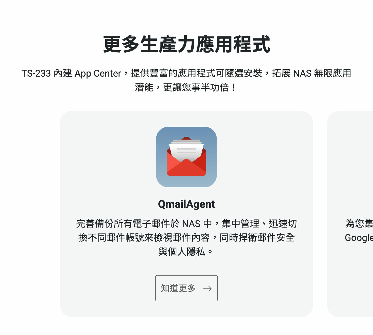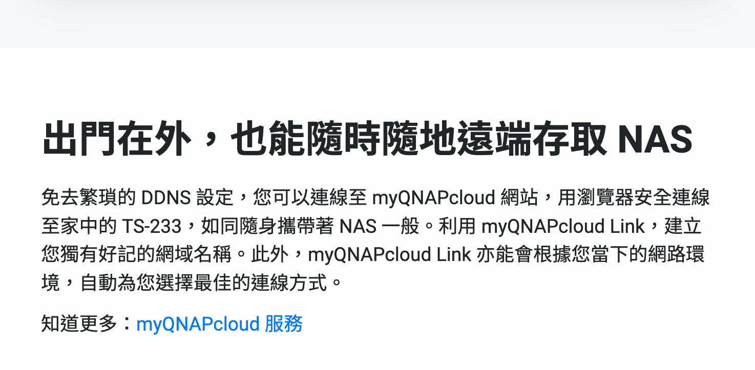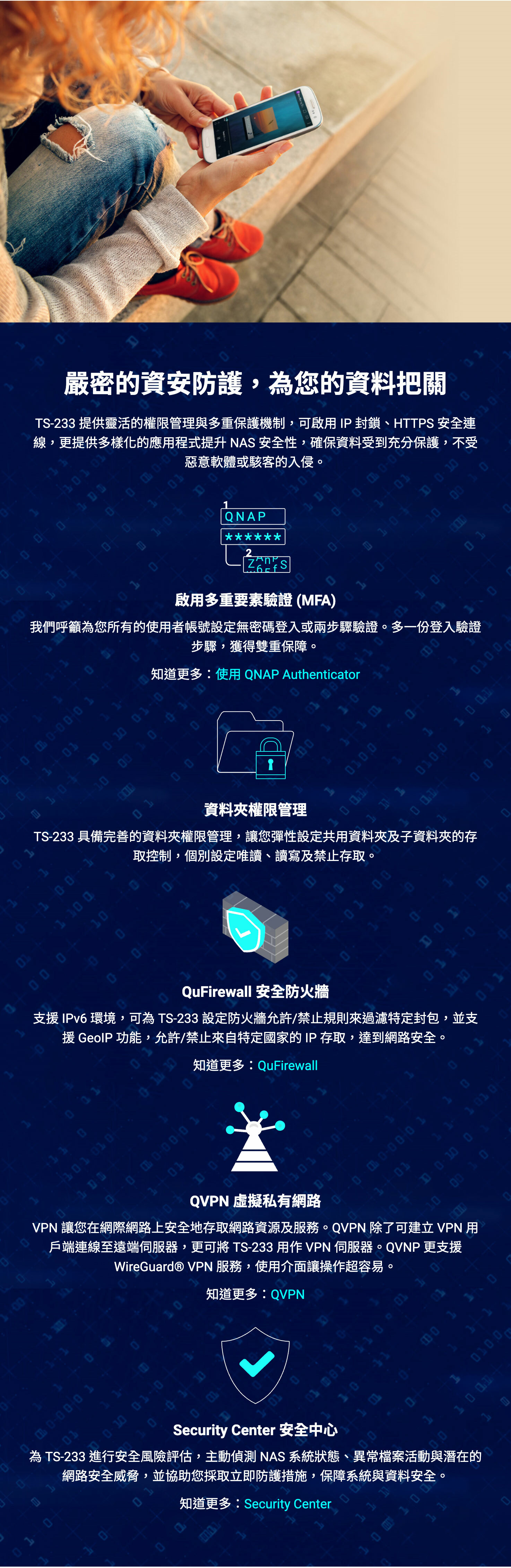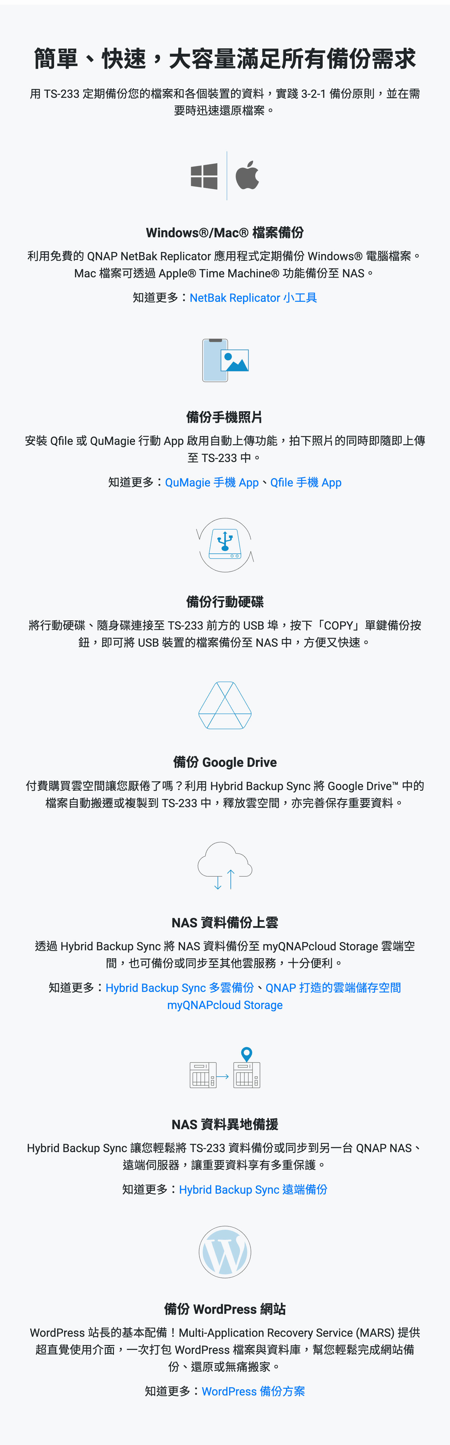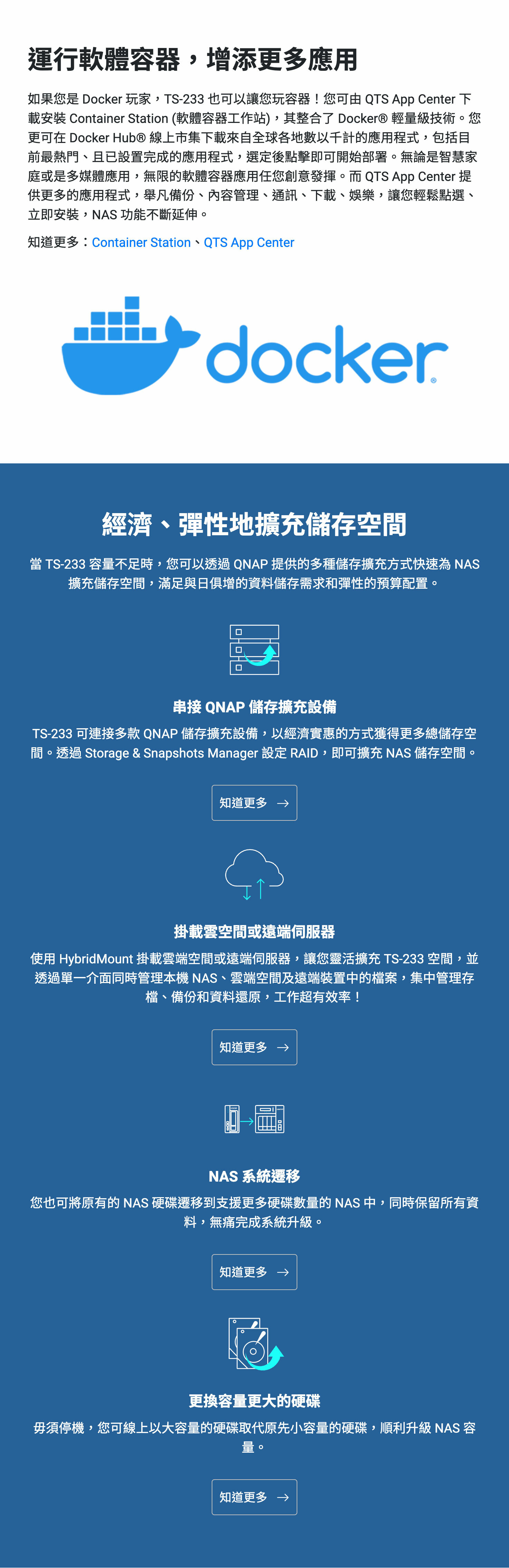 TS-233 提供經濟實惠、功能豐富的雙硬碟 NAS,以 2.0 GHz 實現流暢的檔案存取、同步與分享;完善的檔案備份與快照功能保護您珍貴的數位資產。TS-233 更可作為家庭影音中心,收藏大量影音檔案,搭配豐富的多媒體應用,享樂不受限。TS-233 讓您聰明辦公、自在生活,是工作娛樂兼具的實用個人雲!