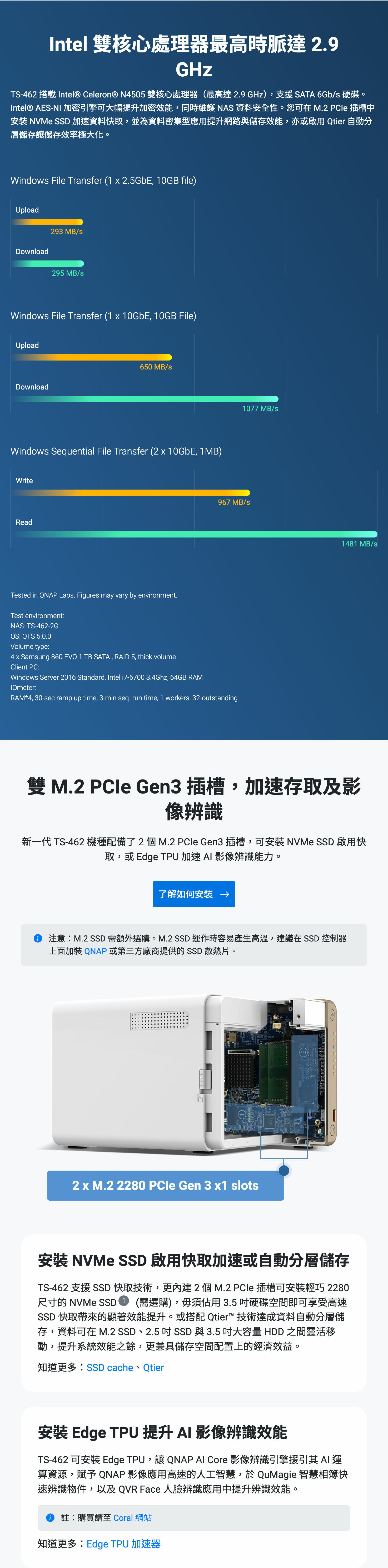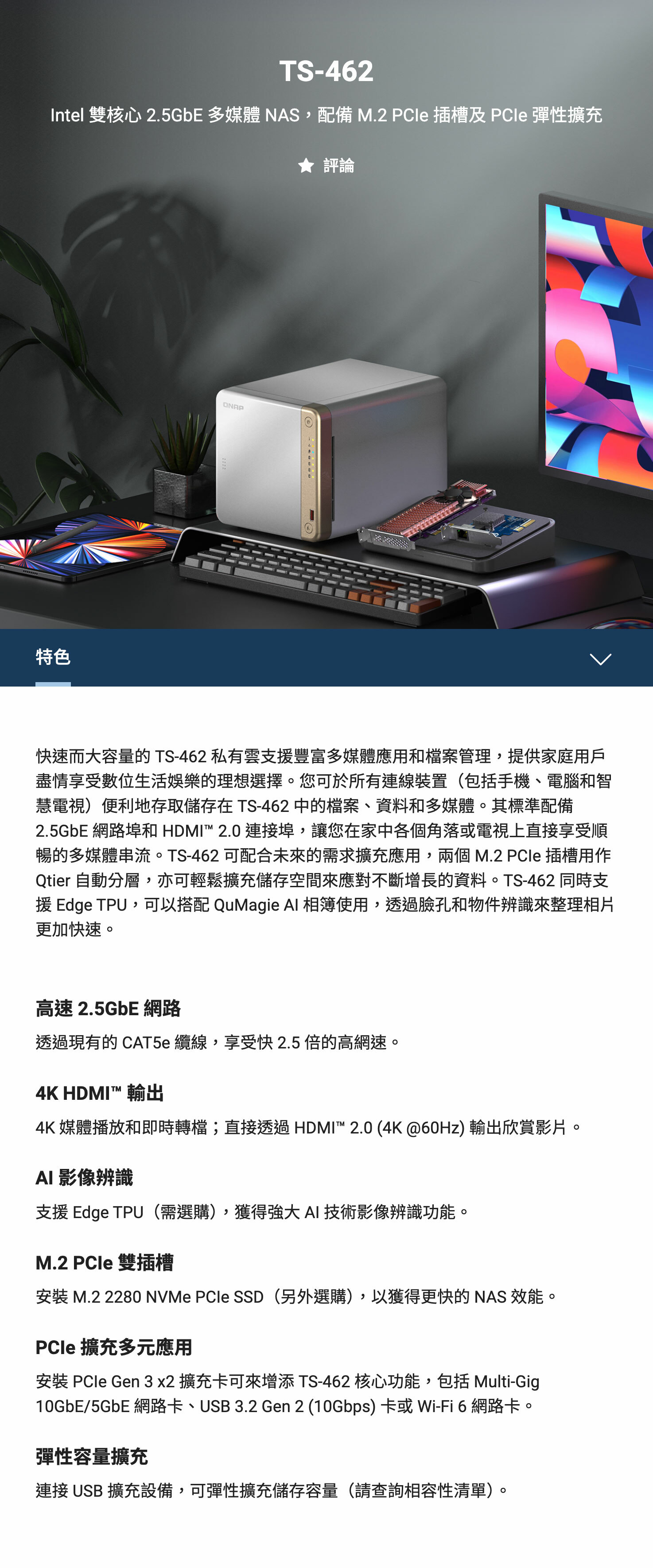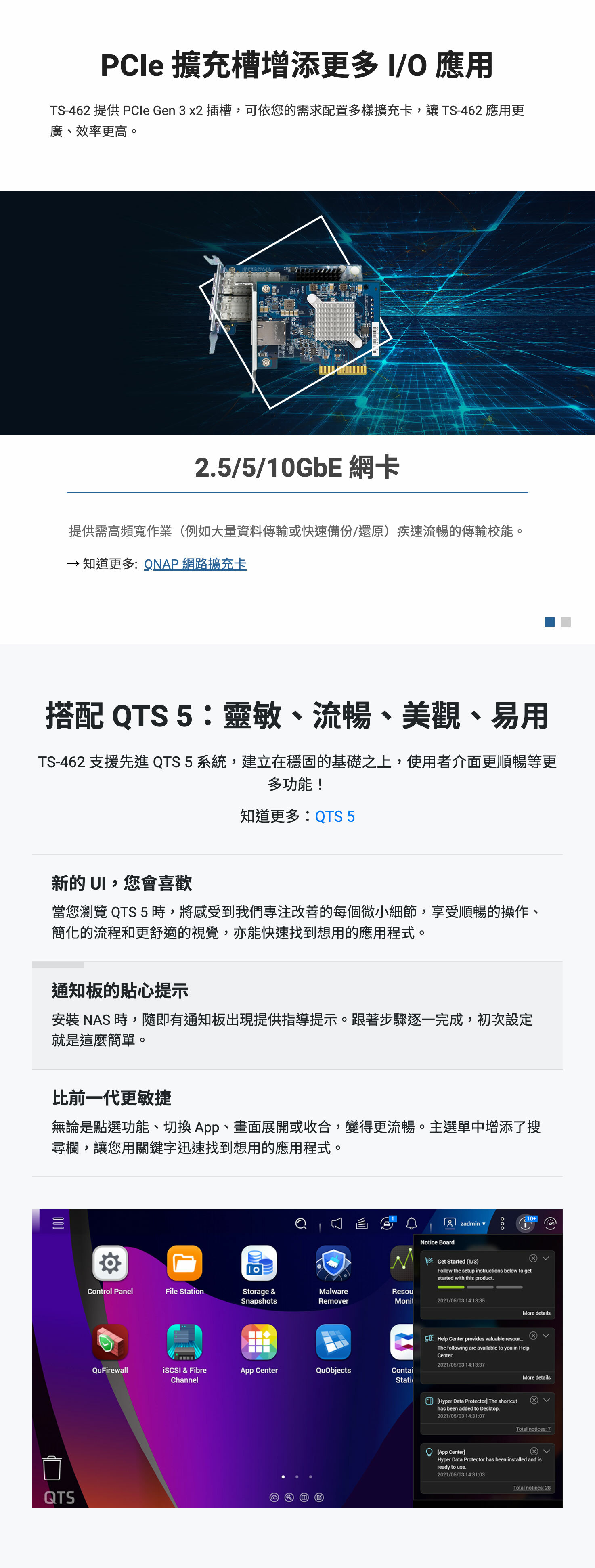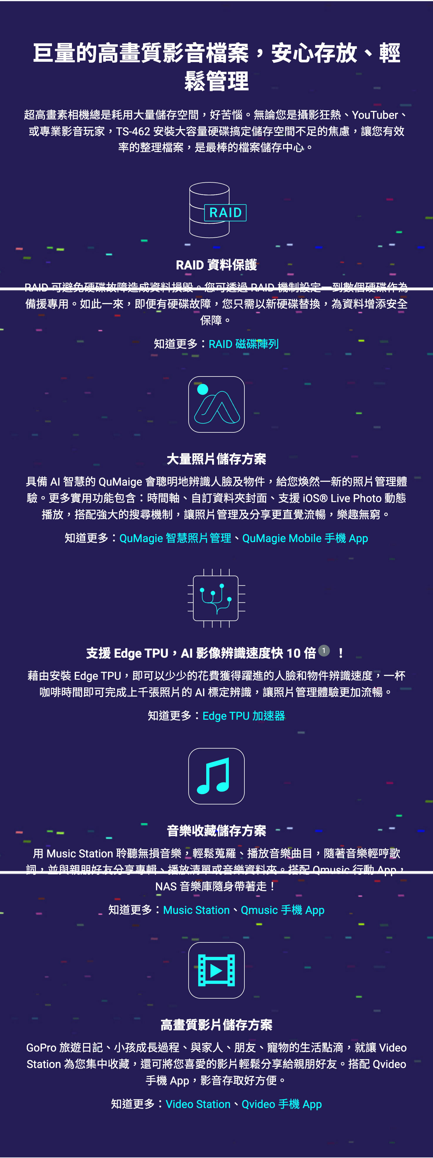 快速而大容量的 TS-462 私有雲支援豐富多媒體應用和檔案管理,提供家庭用戶盡情享受數位生活娛樂的理想選擇。您可於所有連線裝置(包括手機、電腦和智慧電視)便利地存取儲存在 TS-462 中的檔案、資料和多媒體。其標準配備 2.5GbE 網路埠和 HDMI™ 2.0 連接埠,讓您在家中各個角落或電視上直接享受順暢的多媒體串流。TS-462 可配合未來的需求擴充應用,兩個 M.2 PCIe 插槽用作 Qtier 自動分層,亦可輕鬆擴充儲存空間來應對不斷增長的資料。TS-462 同時支援 Edge TPU,可以搭配 QuMagie AI 相簿使用,透過臉孔和物件辨識來整理相片更加快速。