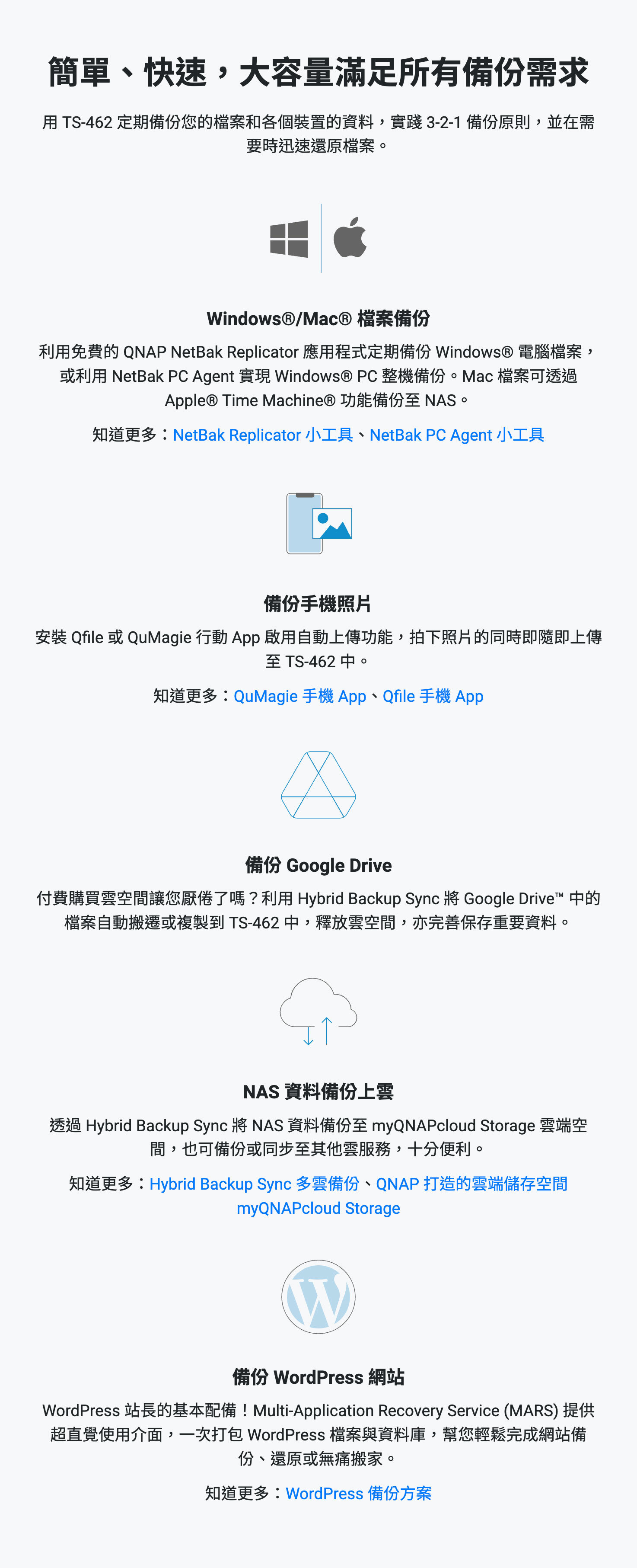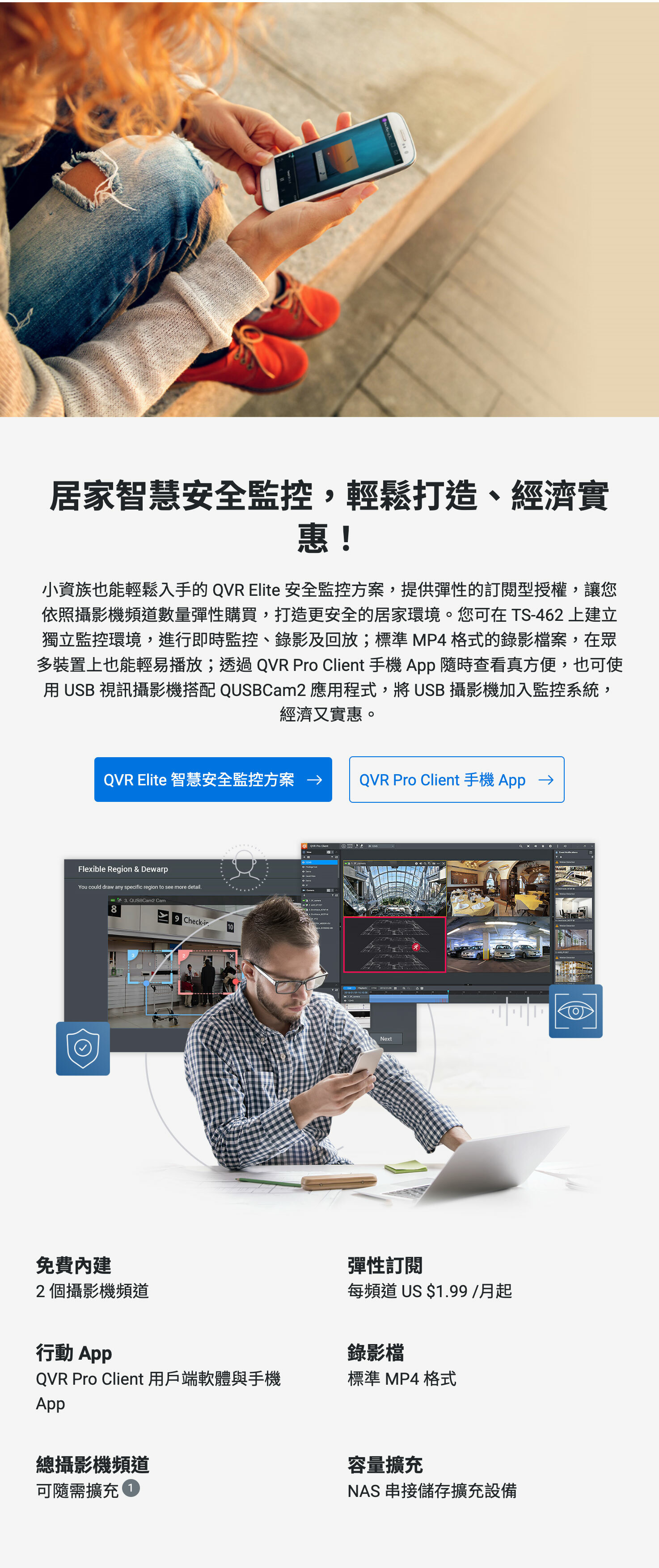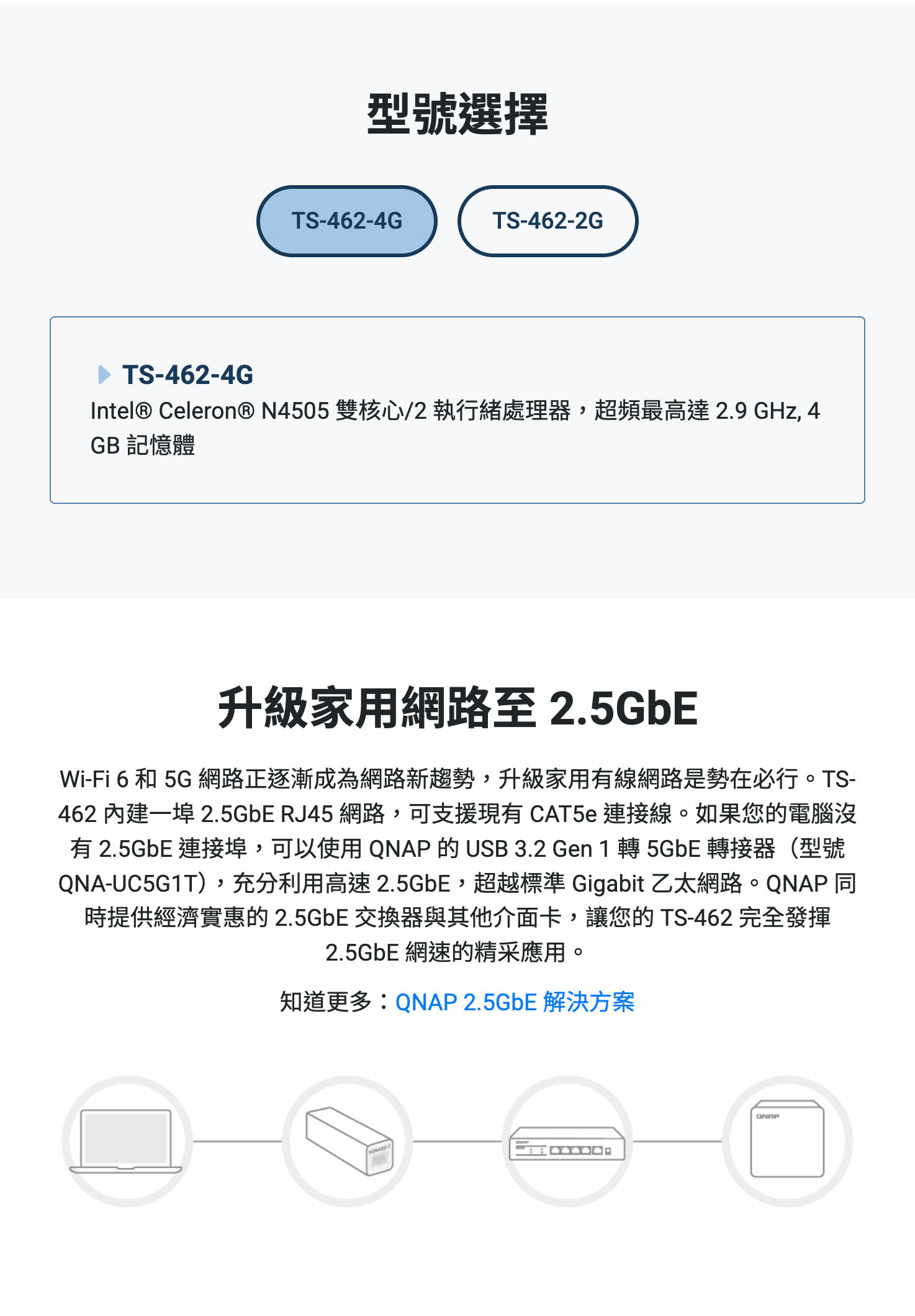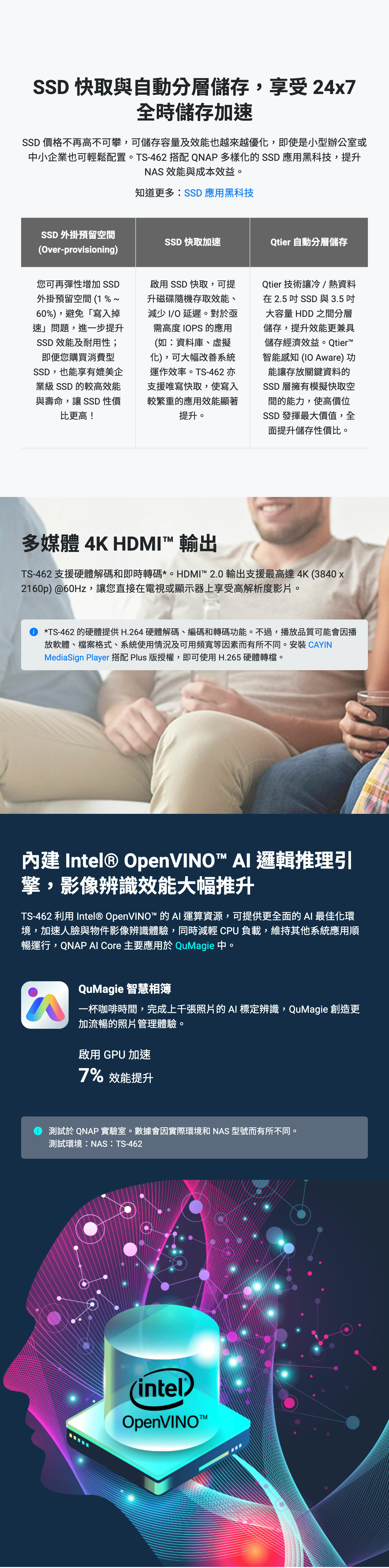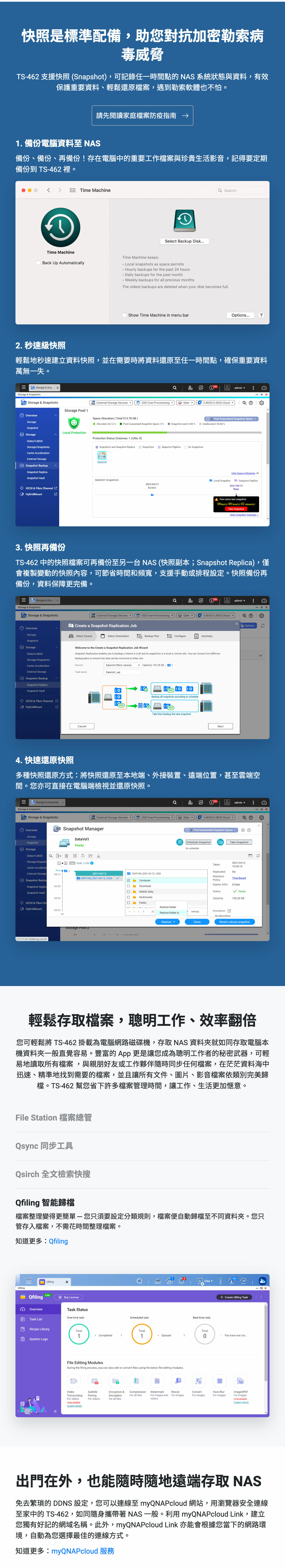 快速而大容量的 TS-462 私有雲支援豐富多媒體應用和檔案管理,提供家庭用戶盡情享受數位生活娛樂的理想選擇。您可於所有連線裝置(包括手機、電腦和智慧電視)便利地存取儲存在 TS-462 中的檔案、資料和多媒體。其標準配備 2.5GbE 網路埠和 HDMI™ 2.0 連接埠,讓您在家中各個角落或電視上直接享受順暢的多媒體串流。TS-462 可配合未來的需求擴充應用,兩個 M.2 PCIe 插槽用作 Qtier 自動分層,亦可輕鬆擴充儲存空間來應對不斷增長的資料。TS-462 同時支援 Edge TPU,可以搭配 QuMagie AI 相簿使用,透過臉孔和物件辨識來整理相片更加快速。
