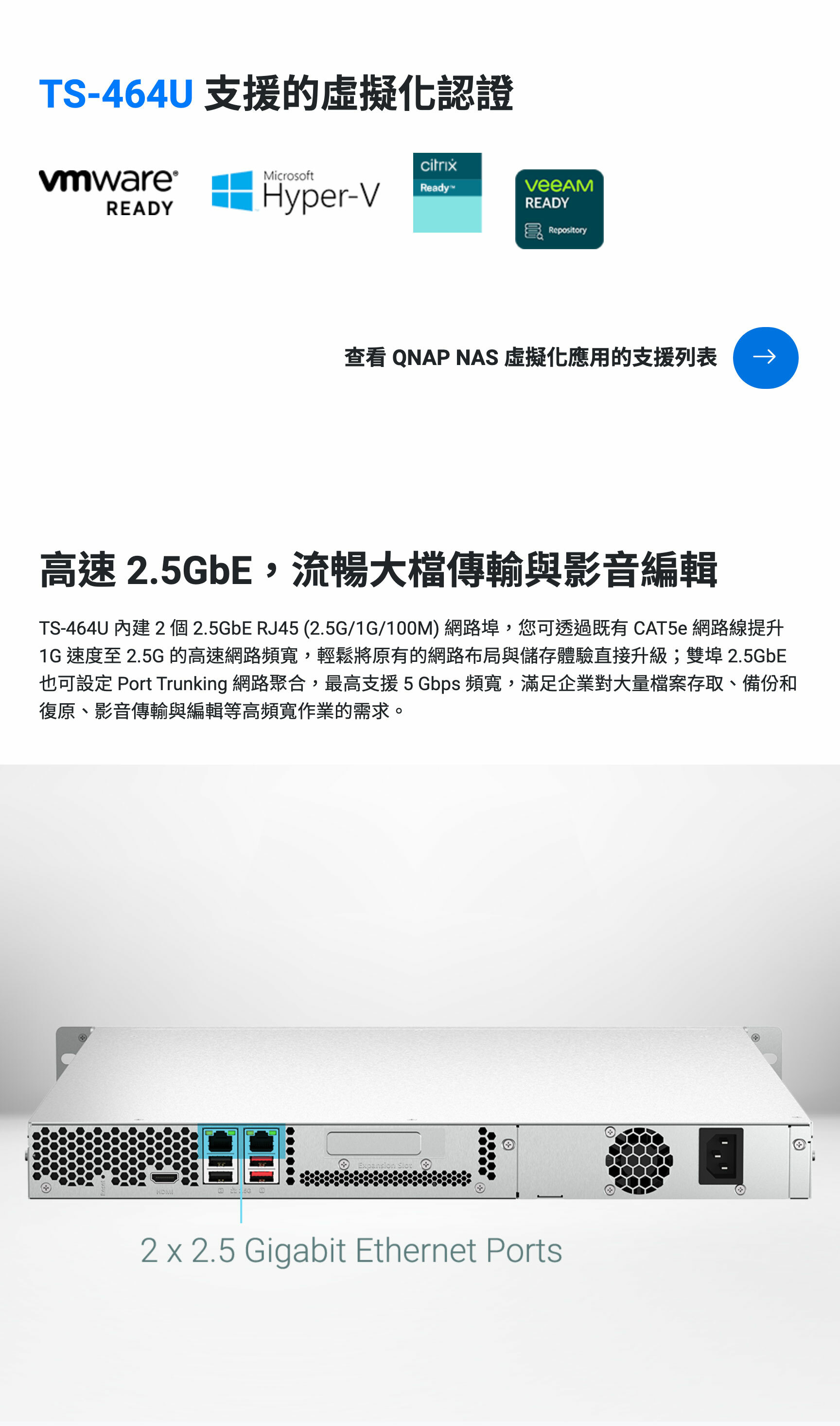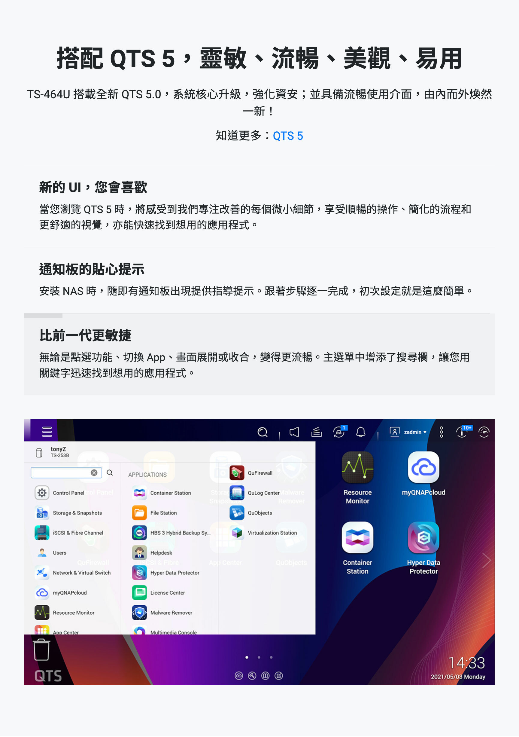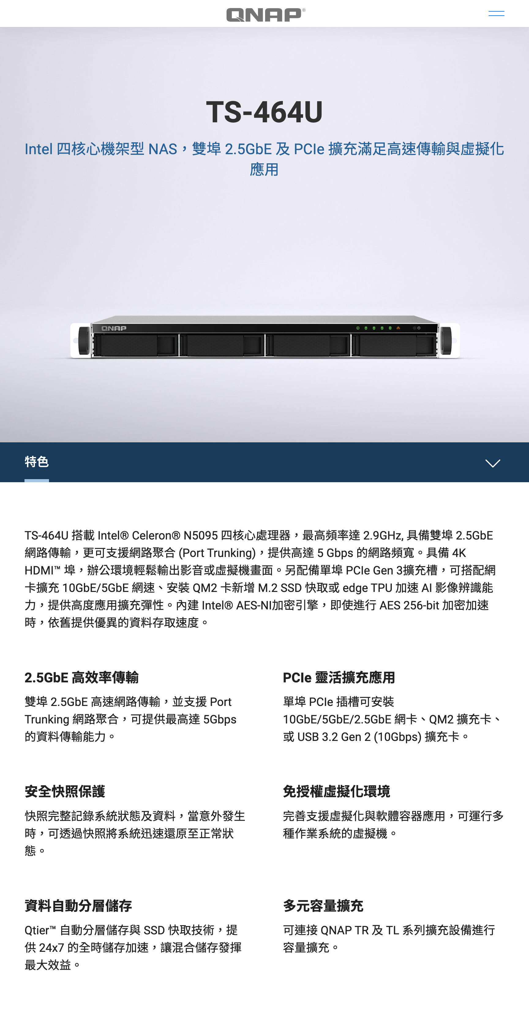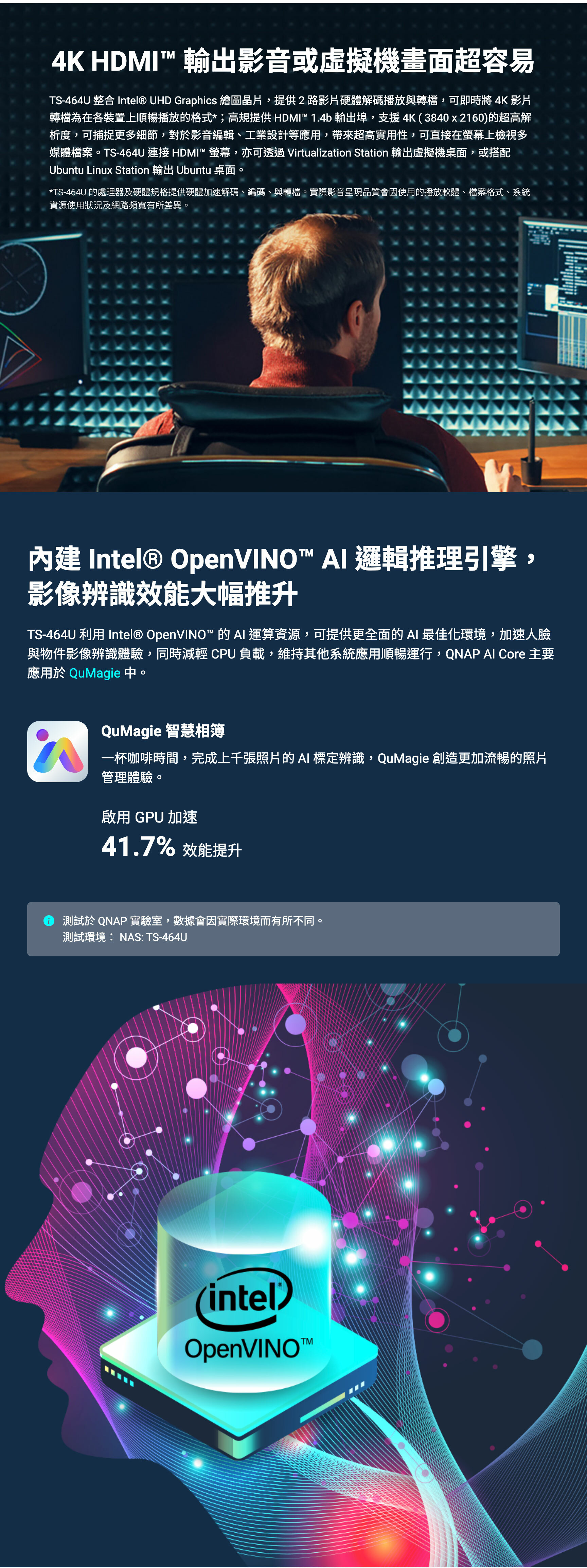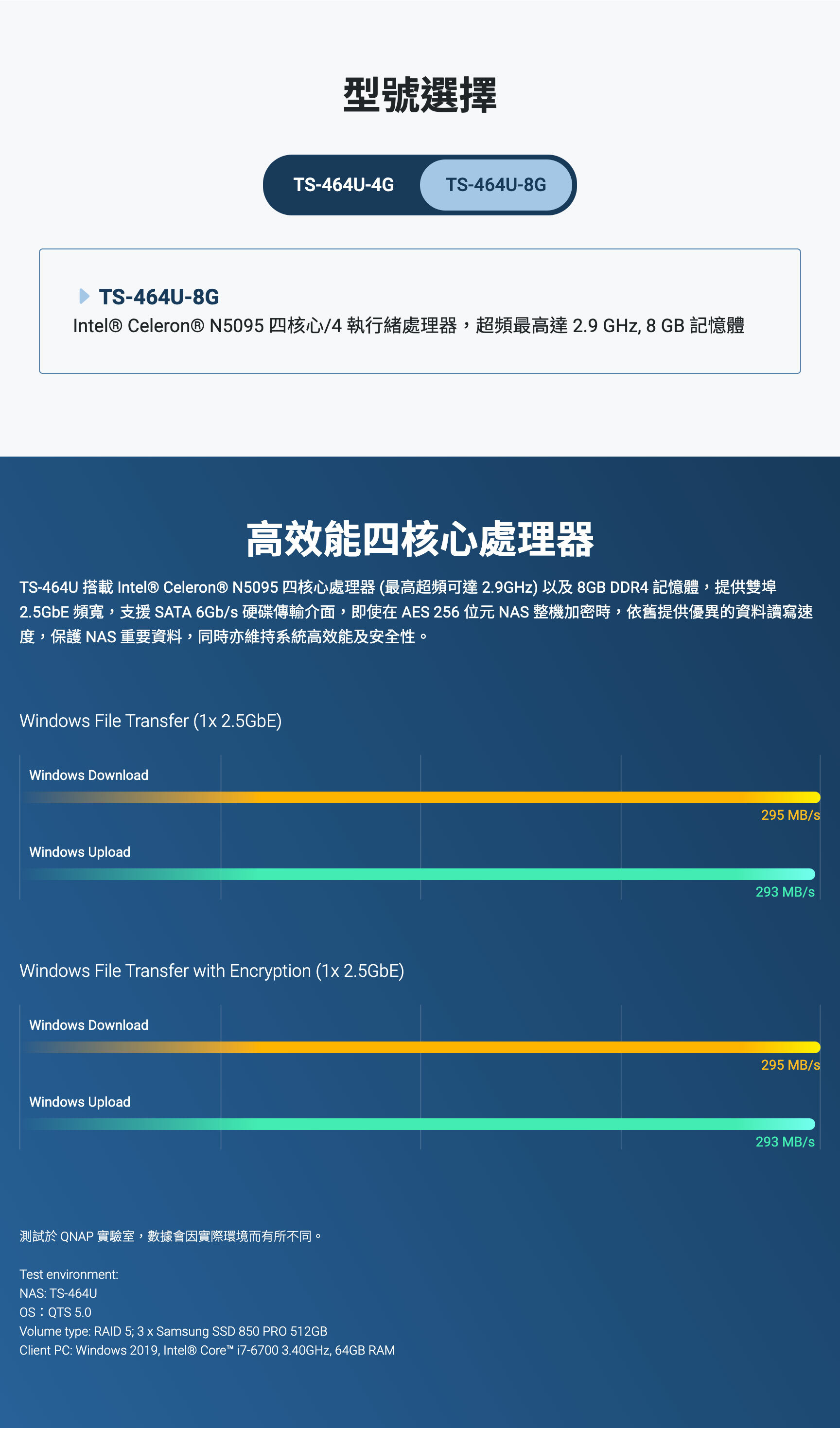 TS-464U 搭載 Intel® Celeron® N5095 四核心處理器,最高頻率達 2.9GHz, 具備雙埠 2.5GbE 網路傳輸,更可支援網路聚合 (Port Trunking),提供高達 5 Gbps 的網路頻寬。具備 4K HDMI™ 埠,辦公環境輕鬆輸出影音或虛擬機畫面。另配備單埠 PCIe Gen 3擴充槽,可搭配網卡擴充 10GbE/5GbE 網速、安裝 QM2 卡新增 M.2 SSD 快取或 edge TPU 加速 AI 影像辨識能力,提供高度應用擴充彈性。內建 Intel® AES-NI加密引擎,即使進行 AES 256-bit 加密加速時,依舊提供優異的資料存取速度