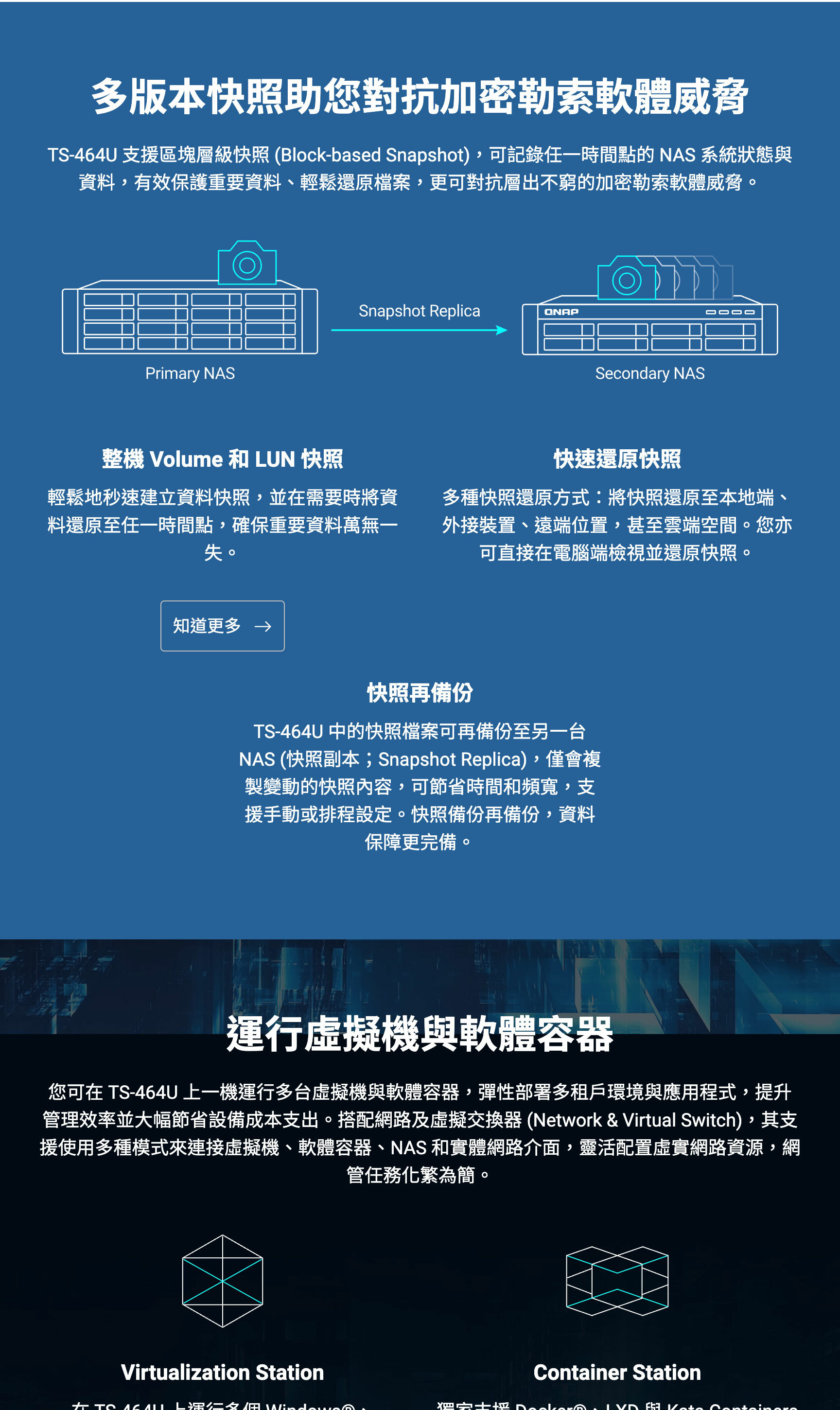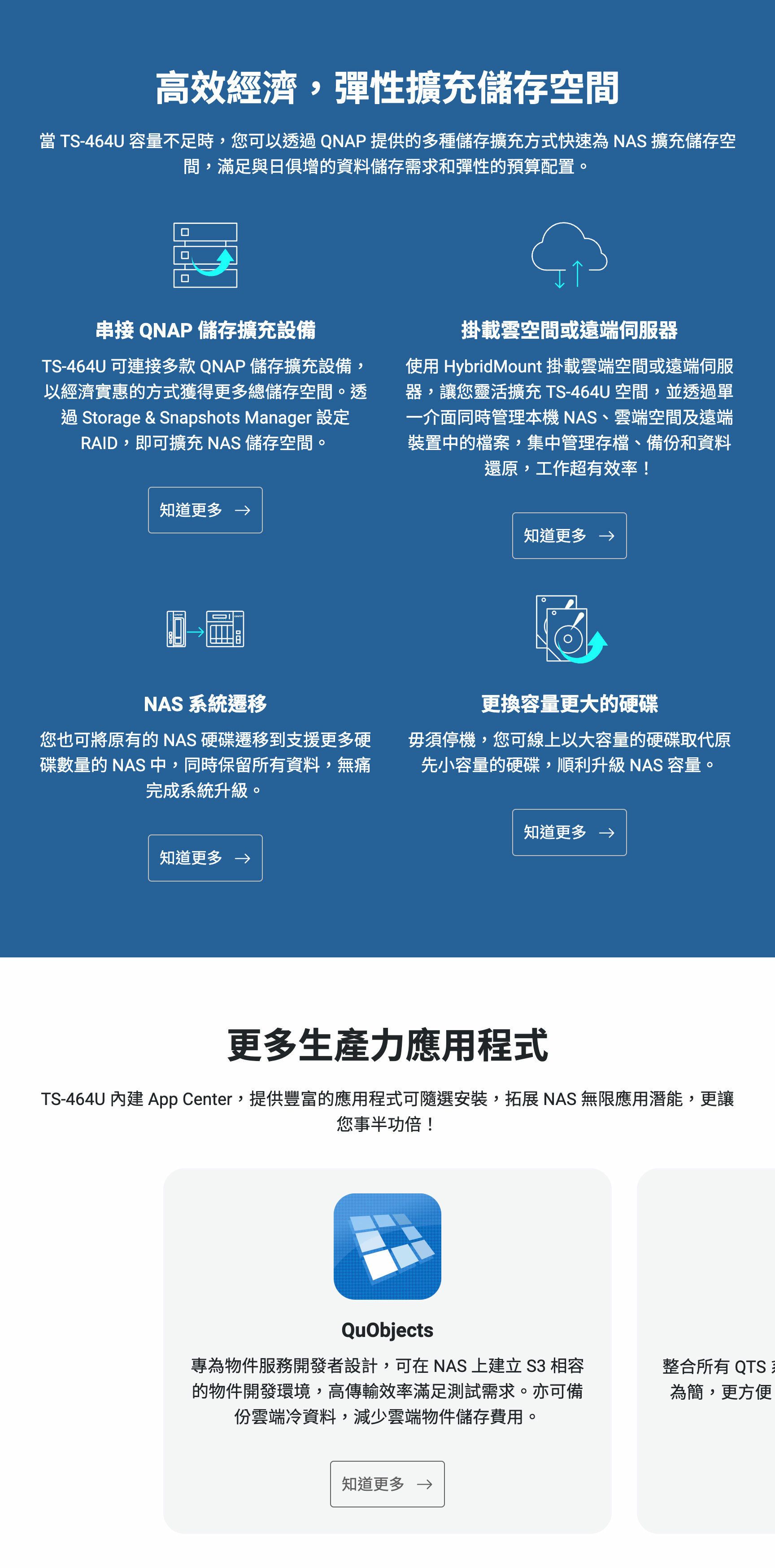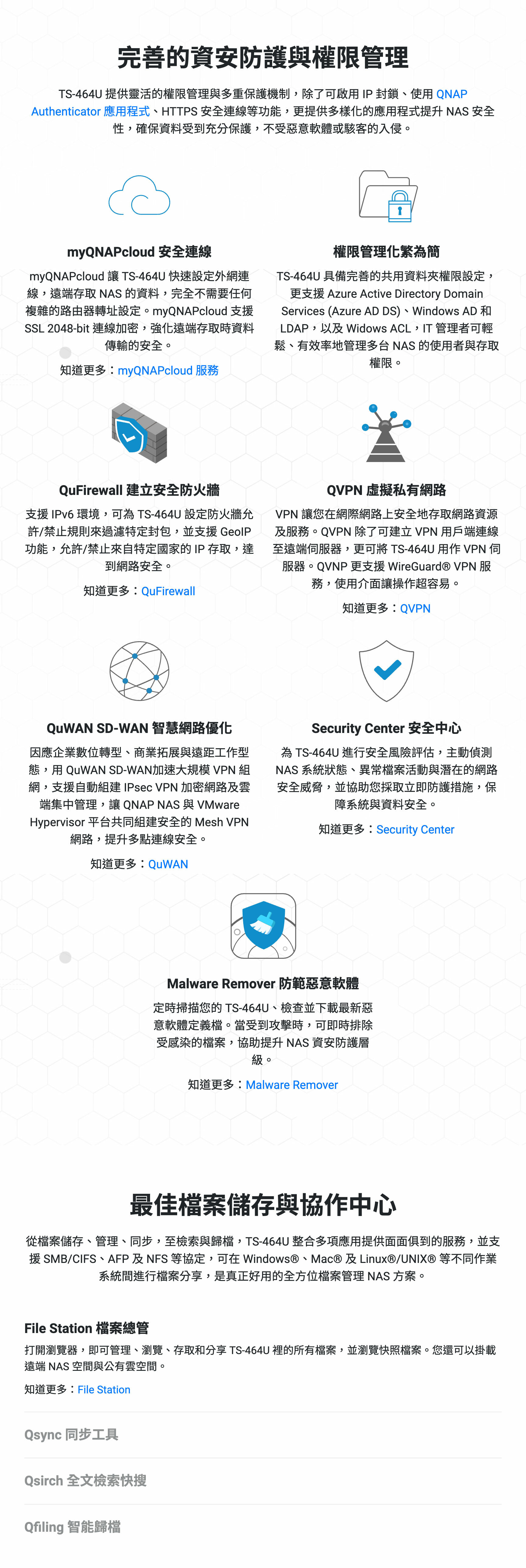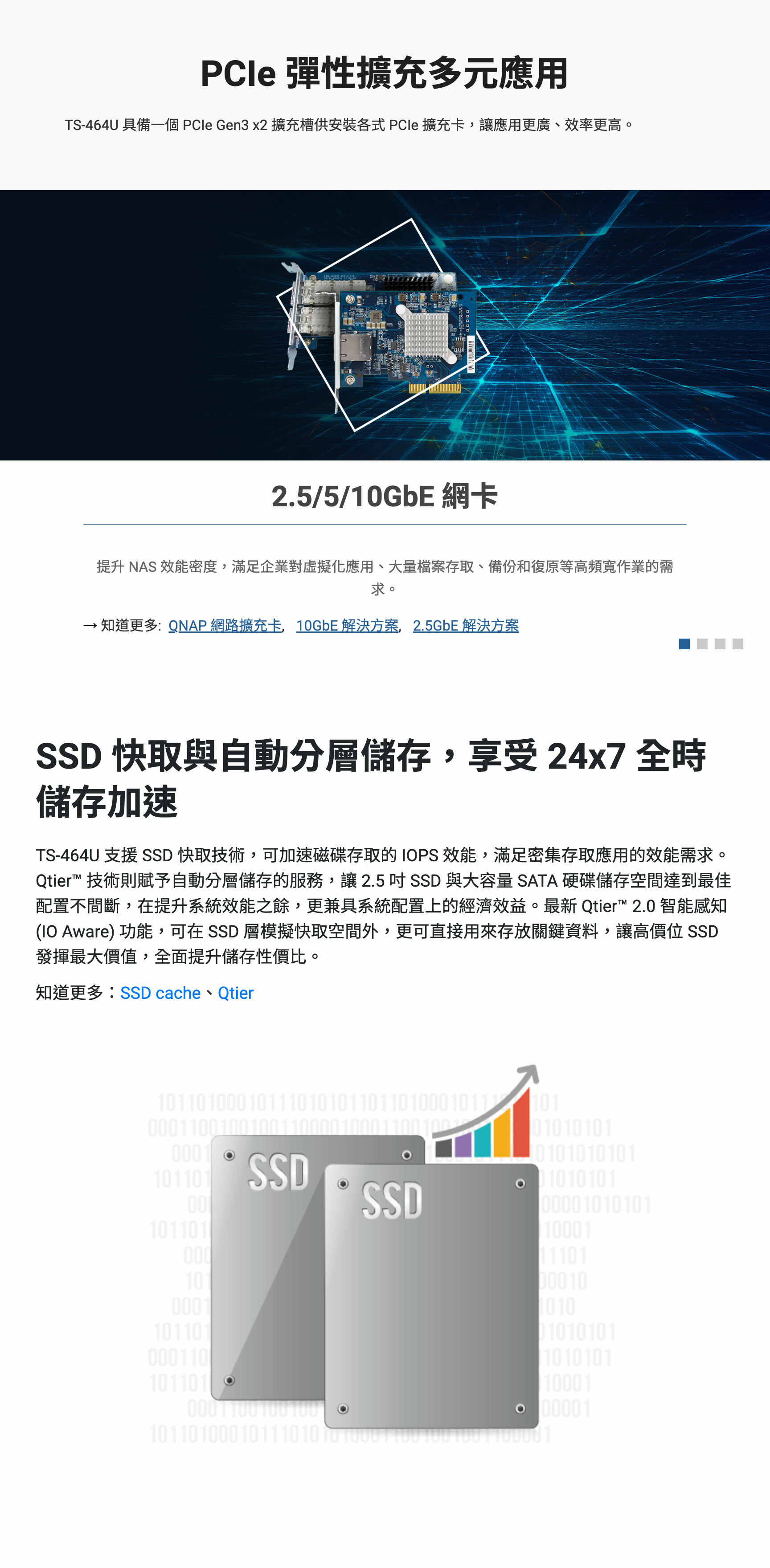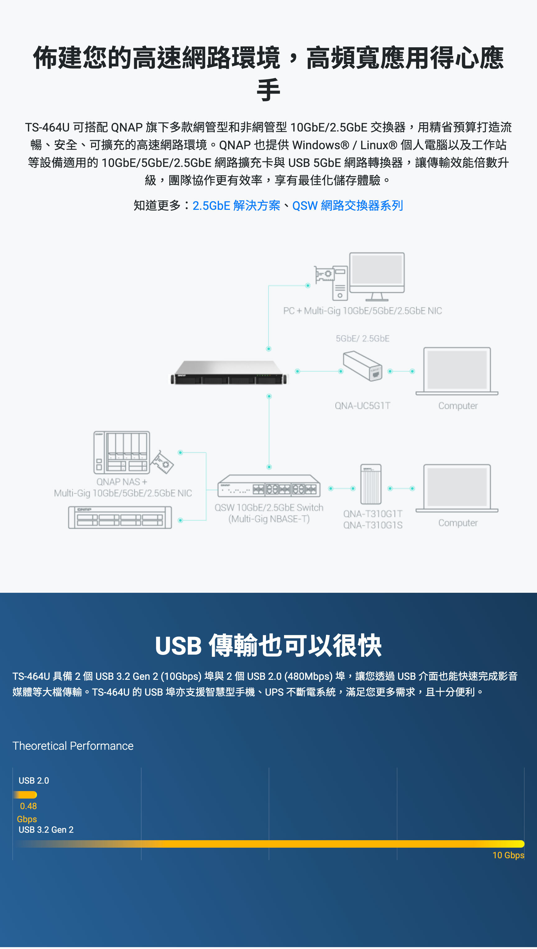 TS-464U 搭載 Intel® Celeron® N5095 四核心處理器,最高頻率達 2.9GHz, 具備雙埠 2.5GbE 網路傳輸,更可支援網路聚合 (Port Trunking),提供高達 5 Gbps 的網路頻寬。具備 4K HDMI™ 埠,辦公環境輕鬆輸出影音或虛擬機畫面。另配備單埠 PCIe Gen 3擴充槽,可搭配網卡擴充 10GbE/5GbE 網速、安裝 QM2 卡新增 M.2 SSD 快取或 edge TPU 加速 AI 影像辨識能力,提供高度應用擴充彈性。內建 Intel® AES-NI加密引擎,即使進行 AES 256-bit 加密加速時,依舊提供優異的資料存取速度