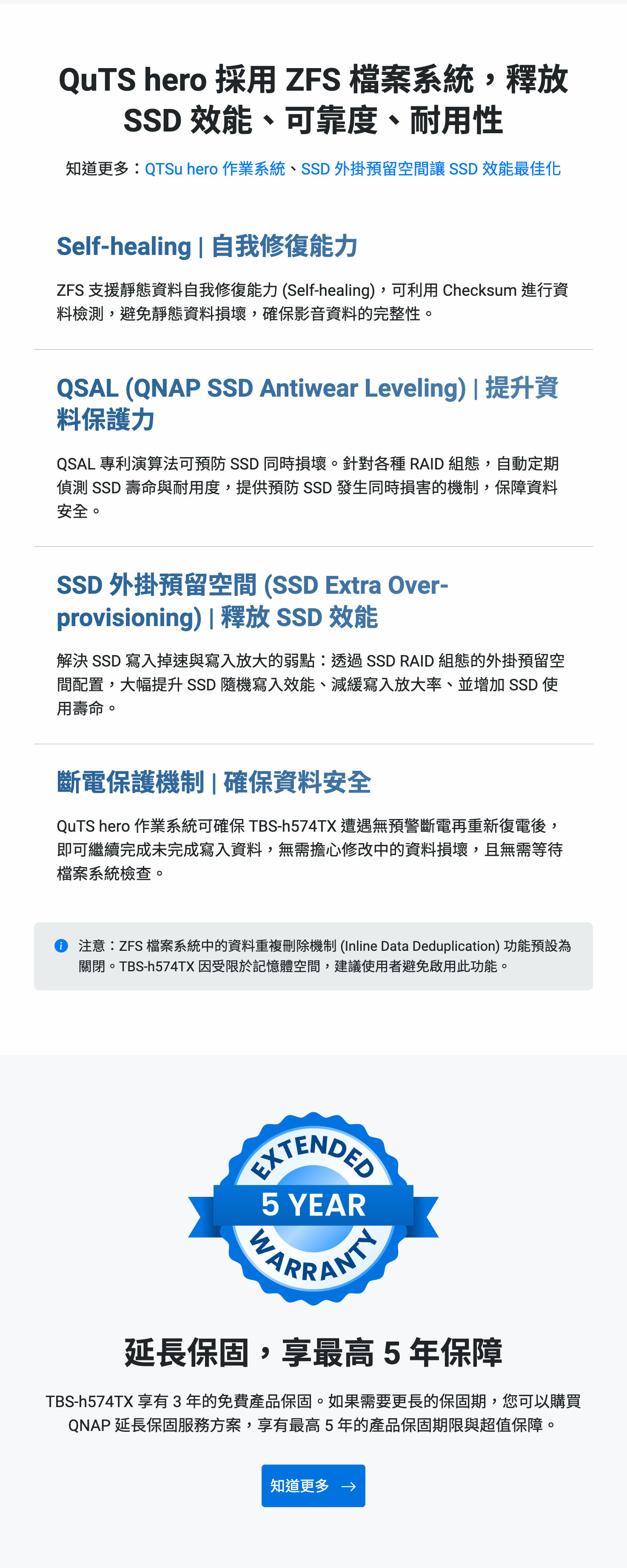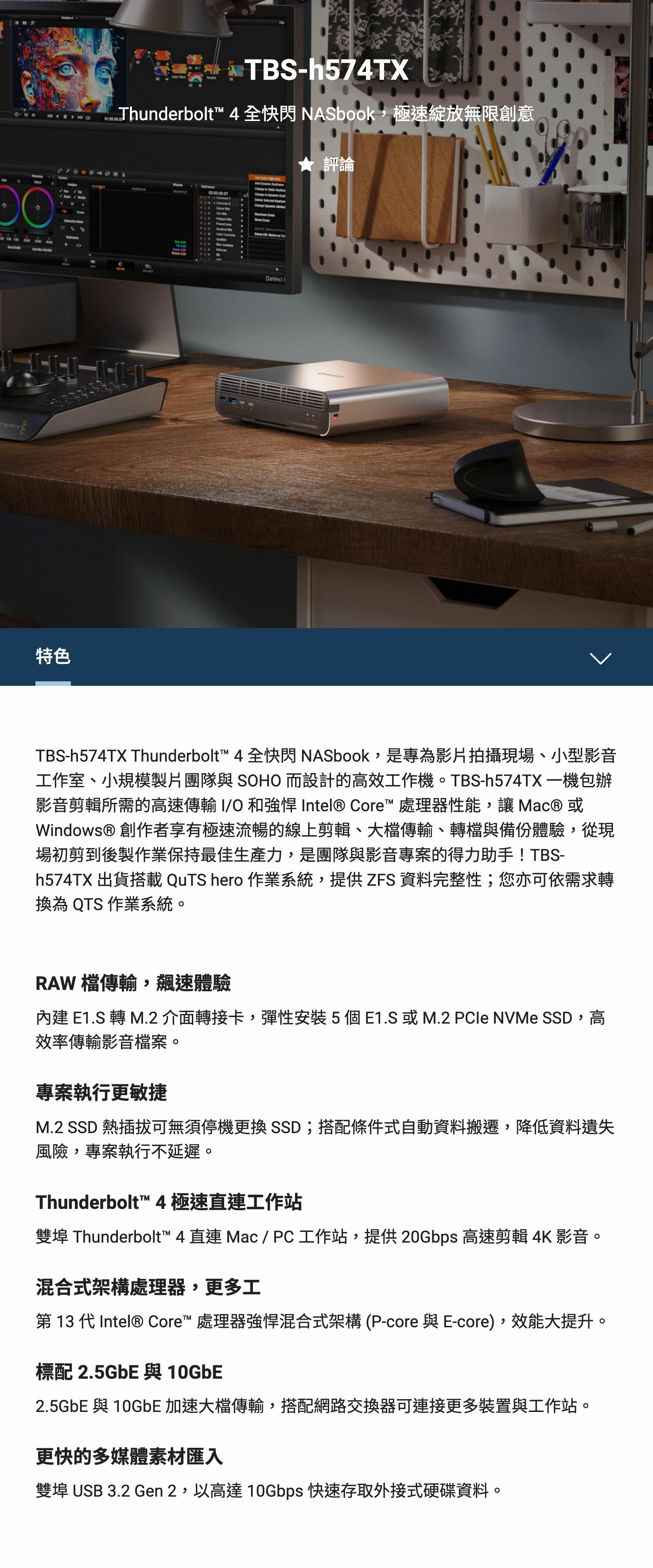 TBS-h574TX Thunderbolt™ 4 全快閃 NASbook,是專為影片拍攝現場、小型影音工作室、小規模製片團隊與 SOHO 而設計的高效工作機。TBS-h574TX 一機包辦影音剪輯所需的高速傳輸 I/O 和強悍 Intel® Core™ 處理器性能,讓 Mac® 或 Windows® 創作者享有極速流暢的線上剪輯、大檔傳輸、轉檔與備份體驗,從現場初剪到後製作業保持最佳生產力,是團隊與影音專案的得力助手!TBS-h574TX 出貨搭載 QuTS hero 作業系統,提供 ZFS 資料完整性;您亦可依需求轉換為 QTS 作業系統。