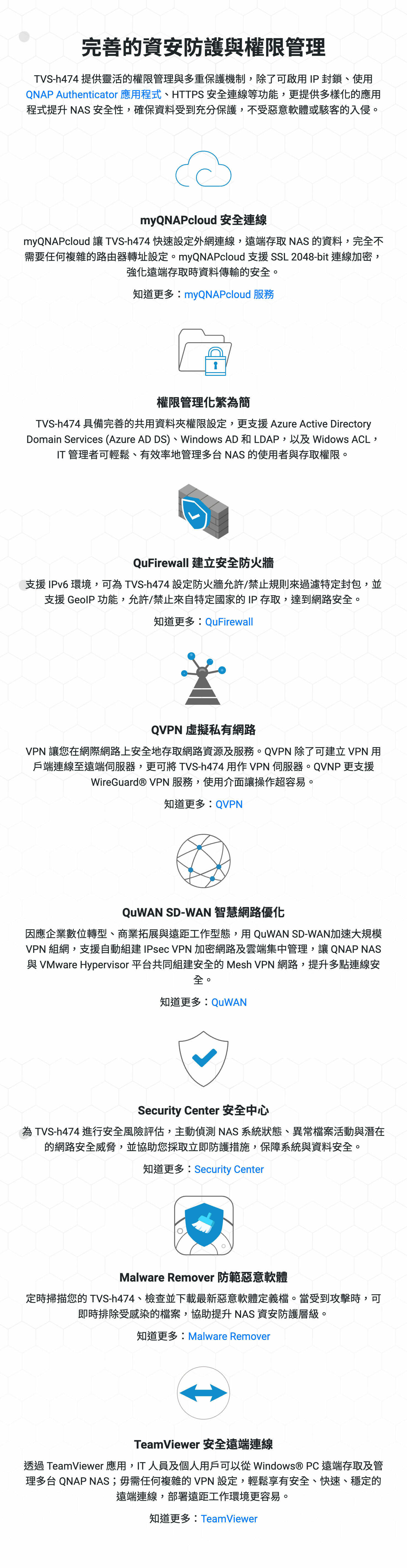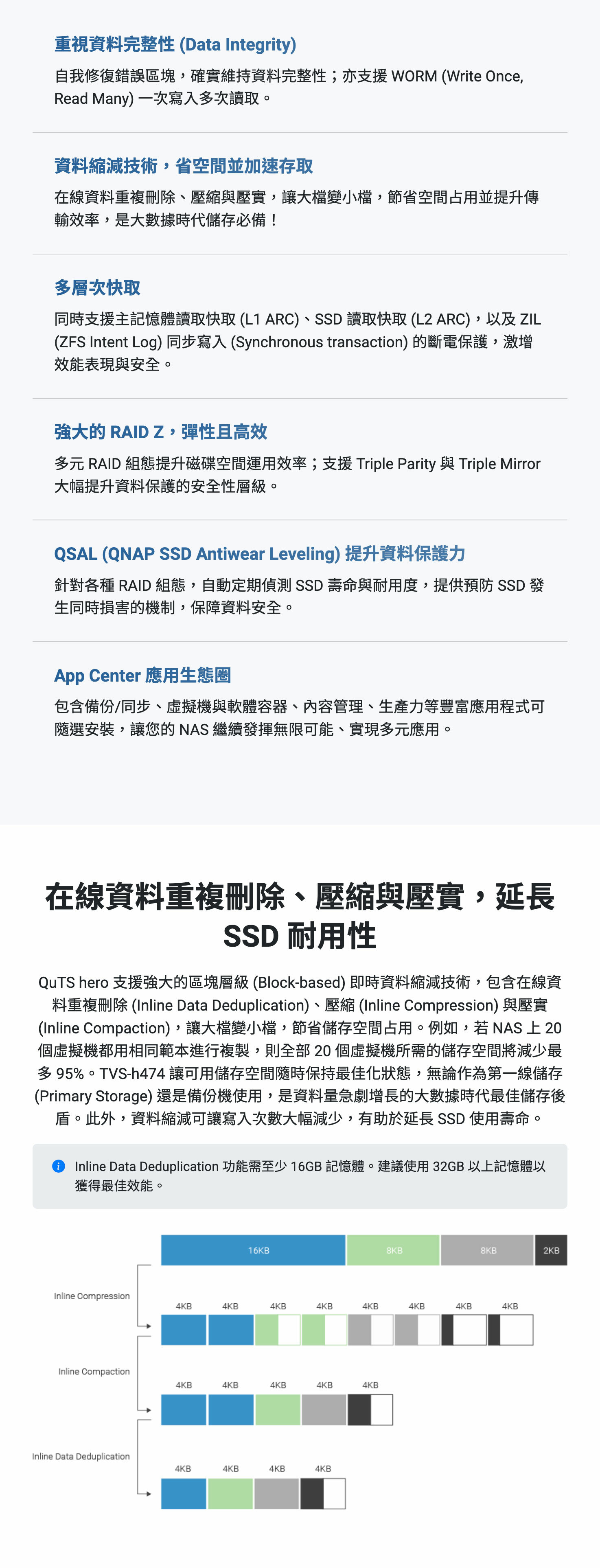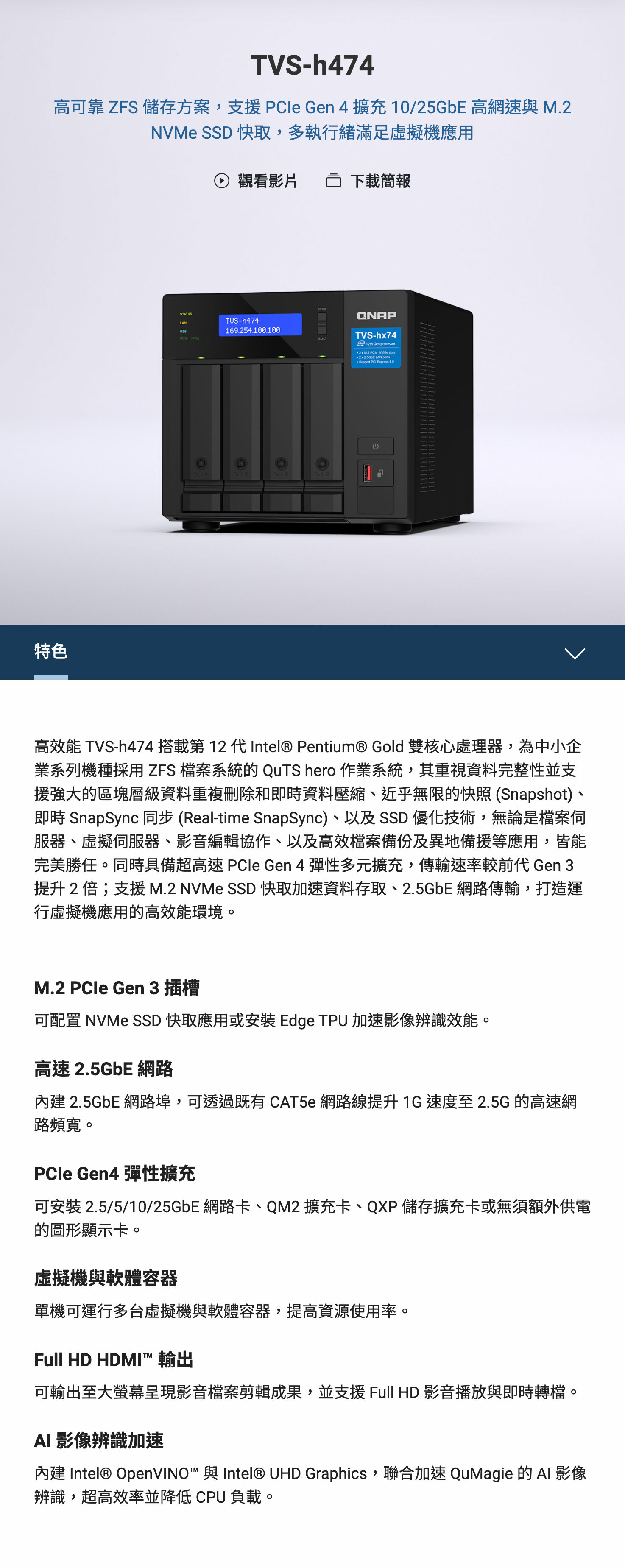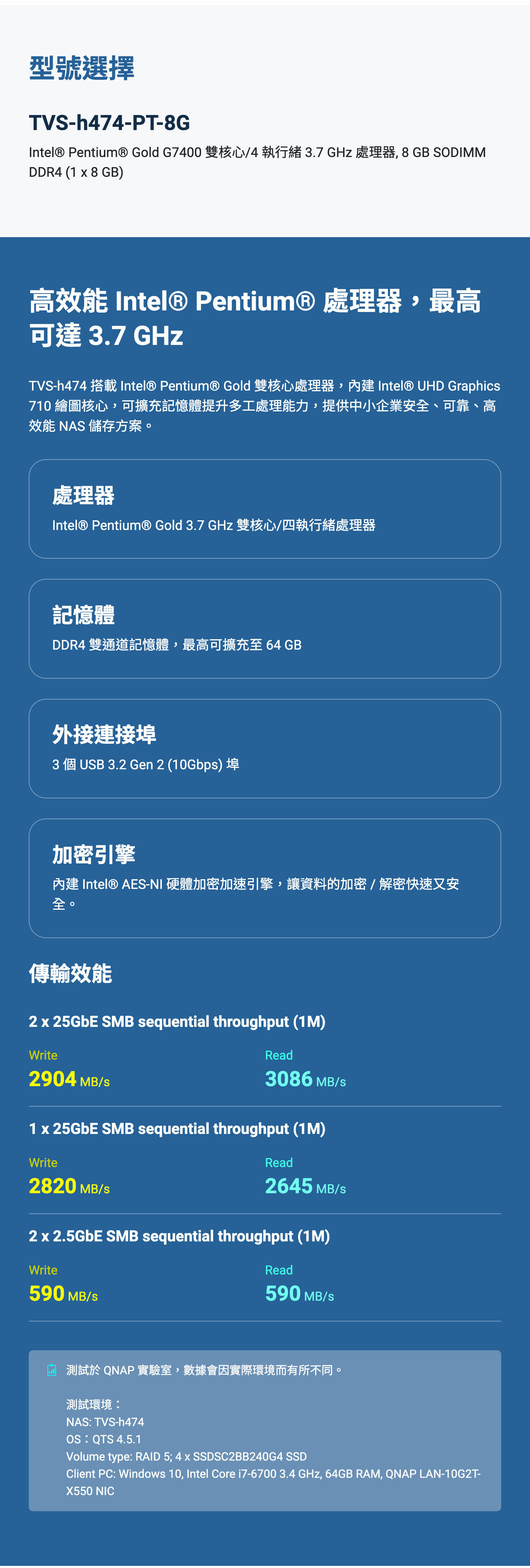 高效能 TVS-h474 搭載第 12 代 Intel® Pentium® Gold 雙核心處理器,為中小企業系列機種採用 ZFS 檔案系統的 QuTS hero 作業系統,其重視資料完整性並支援強大的區塊層級資料重複刪除和即時資料壓縮、近乎無限的快照 (Snapshot)、即時 SnapSync 同步 (Real-time SnapSync)、以及 SSD 優化技術,無論是檔案伺服器、虛擬伺服器、影音編輯協作、以及高效檔案備份及異地備援等應用,皆能完美勝任。同時具備超高速 PCIe Gen 4 彈性多元擴充,傳輸速率較前代 Gen 3 提升 2 倍;支援 M.2 NVMe SSD 快取加速資