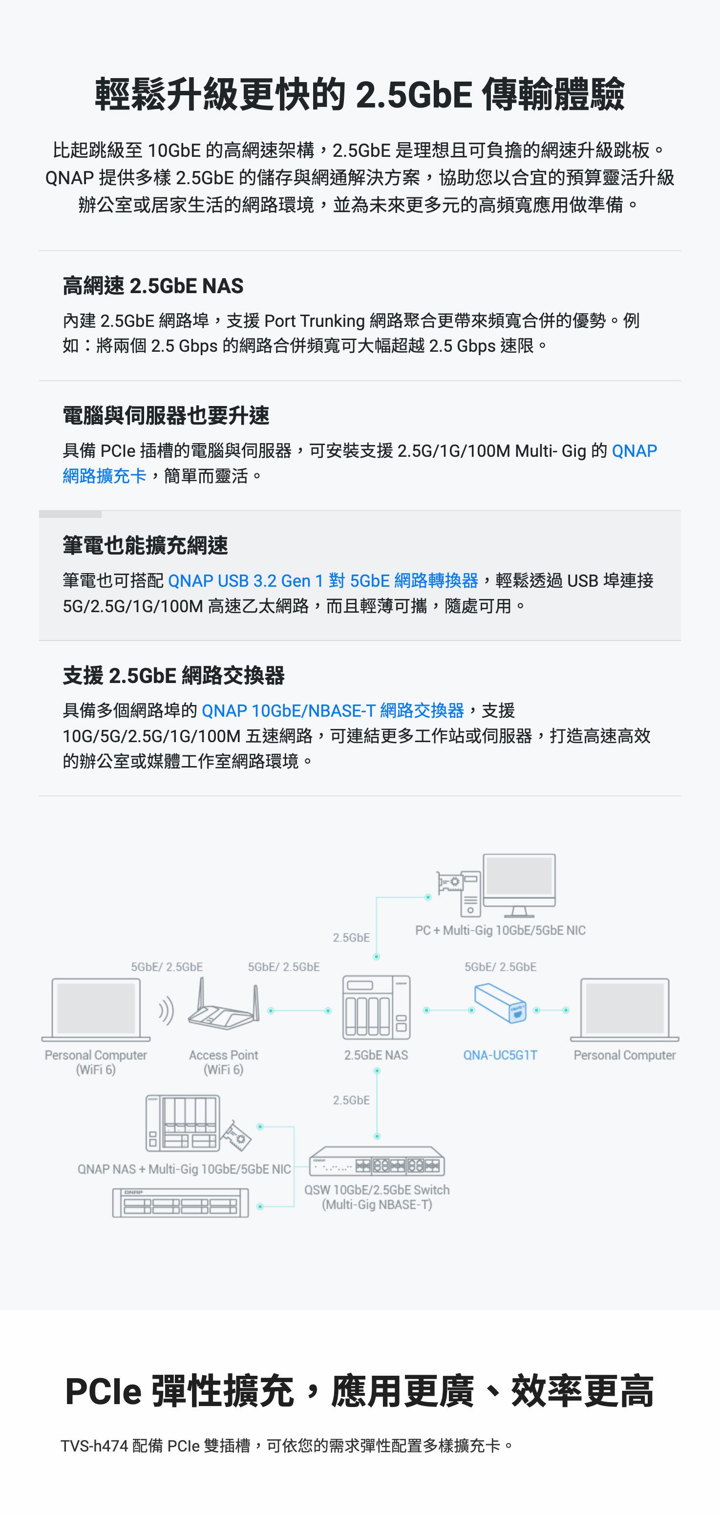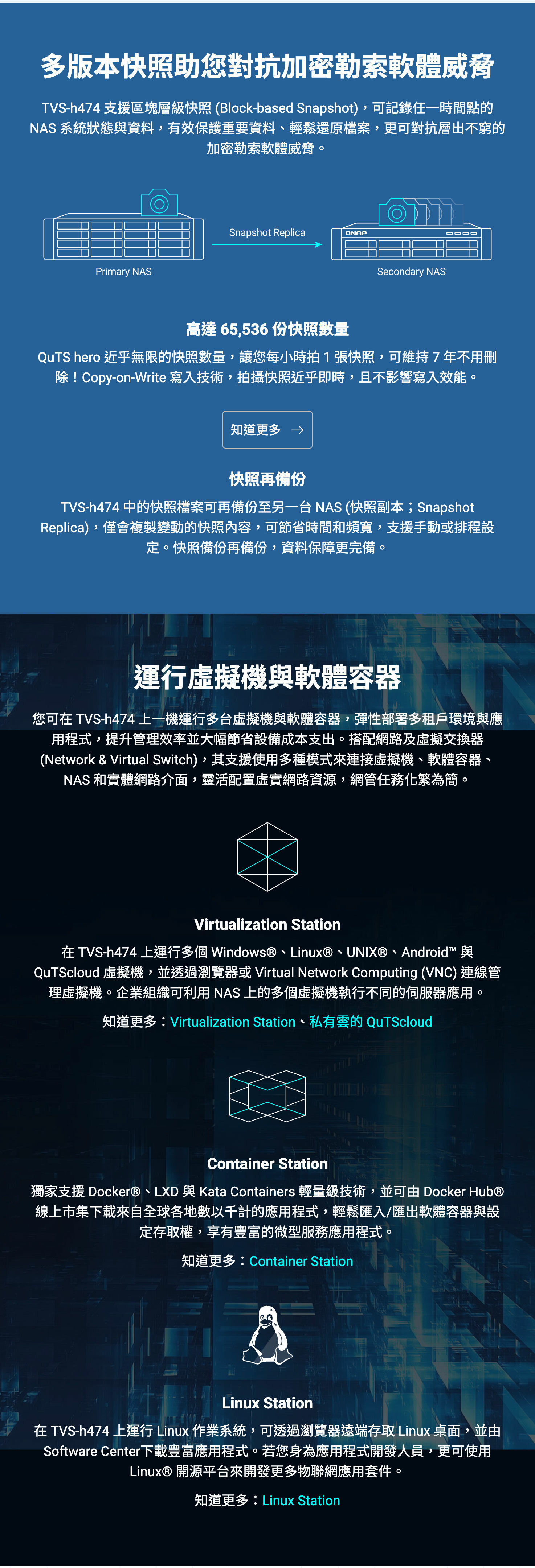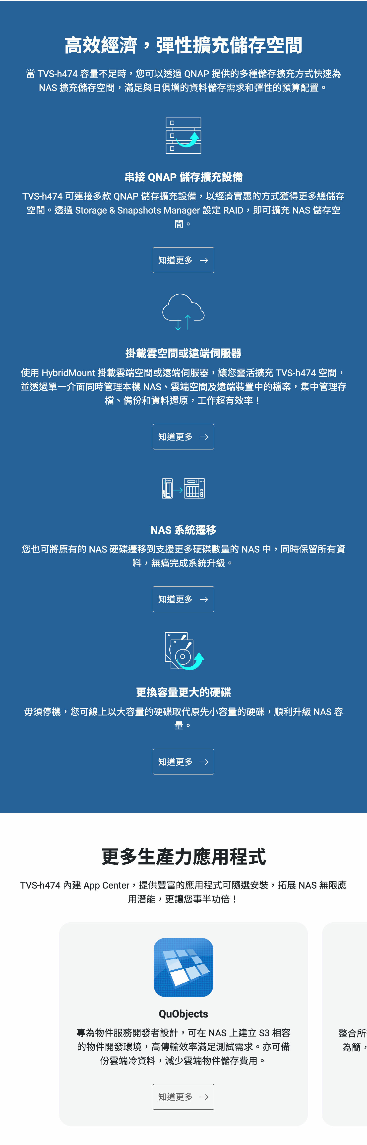 高效能 TVS-h474 搭載第 12 代 Intel® Pentium® Gold 雙核心處理器,為中小企業系列機種採用 ZFS 檔案系統的 QuTS hero 作業系統,其重視資料完整性並支援強大的區塊層級資料重複刪除和即時資料壓縮、近乎無限的快照 (Snapshot)、即時 SnapSync 同步 (Real-time SnapSync)、以及 SSD 優化技術,無論是檔案伺服器、虛擬伺服器、影音編輯協作、以及高效檔案備份及異地備援等應用,皆能完美勝任。同時具備超高速 PCIe Gen 4 彈性多元擴充,傳輸速率較前代 Gen 3 提升 2 倍;支援 M.2 NVMe SSD 快取加速資