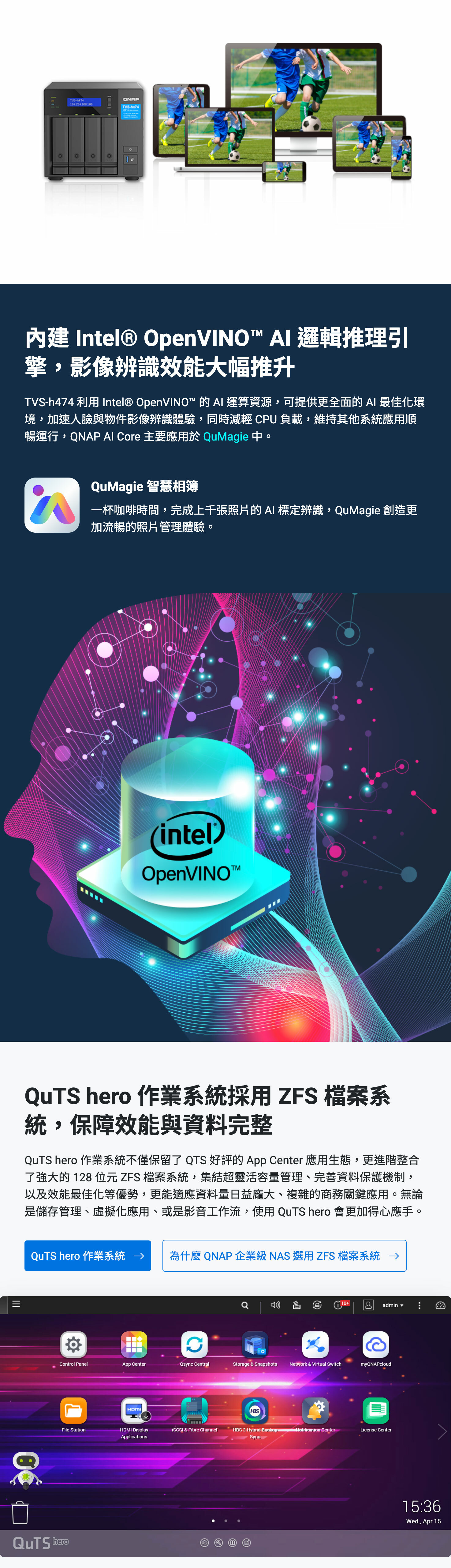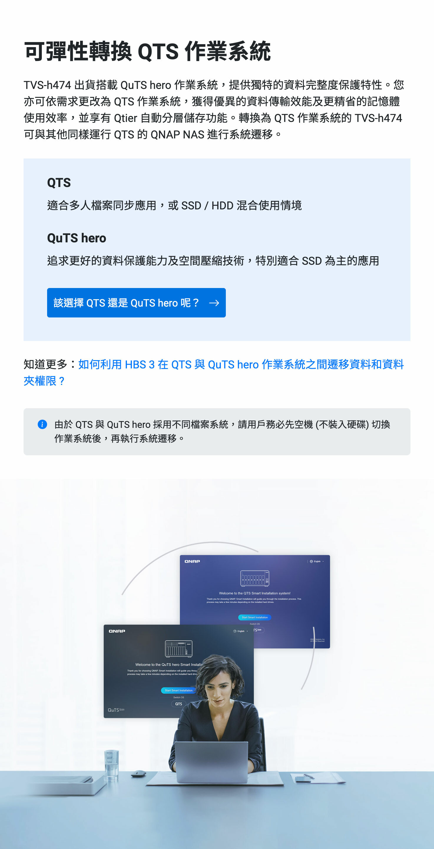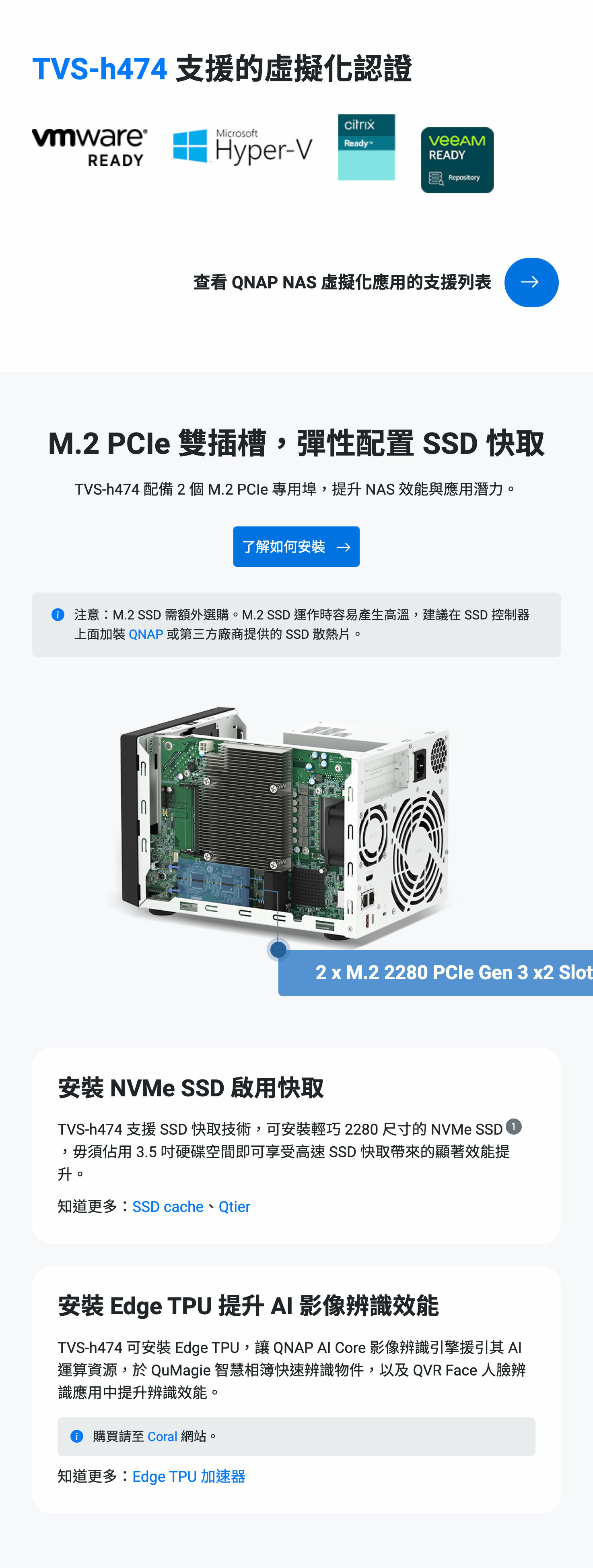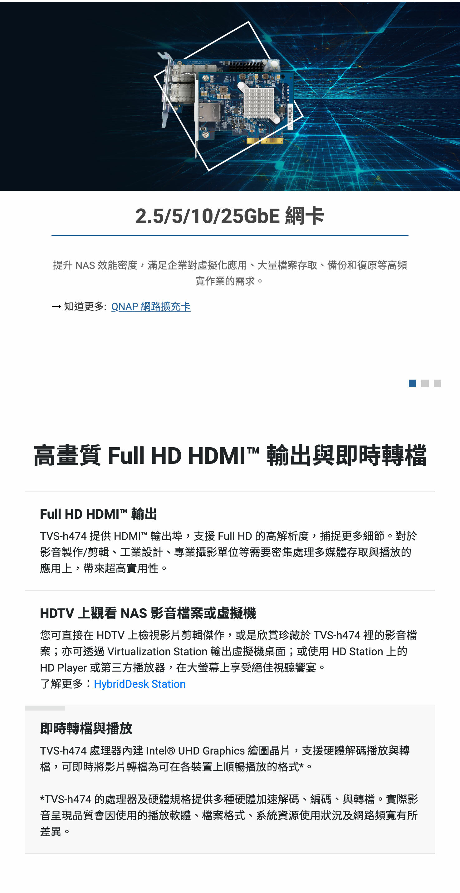 高效能 TVS-h474 搭載第 12 代 Intel® Pentium® Gold 雙核心處理器,為中小企業系列機種採用 ZFS 檔案系統的 QuTS hero 作業系統,其重視資料完整性並支援強大的區塊層級資料重複刪除和即時資料壓縮、近乎無限的快照 (Snapshot)、即時 SnapSync 同步 (Real-time SnapSync)、以及 SSD 優化技術,無論是檔案伺服器、虛擬伺服器、影音編輯協作、以及高效檔案備份及異地備援等應用,皆能完美勝任。同時具備超高速 PCIe Gen 4 彈性多元擴充,傳輸速率較前代 Gen 3 提升 2 倍;支援 M.2 NVMe SSD 快取加速資